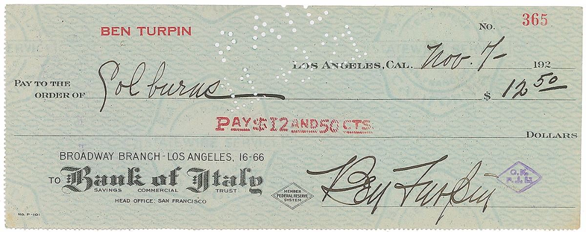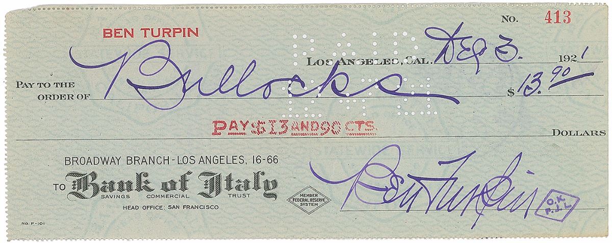 Two personal checks, both 8.5 x 3.25, filled out and signed by Turpin, payable to “Colburns” and “Bullocks,” dated November 7, and December 3, 1921. In overall fine condition. Accompanied by two unsigned photos of the renowned silent film comedian.