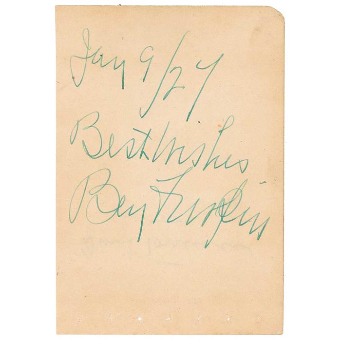 Vintage fountain pen signature, “Jan 9/27, Best wishes, Ben Turpin,” on an off-white 4 x 5.5 album page. Marginal binding holes along bottom edge, and a mild overall shade of toning, otherwise fine condition. Pre-certified PSA/DNA and RRAuction COA.