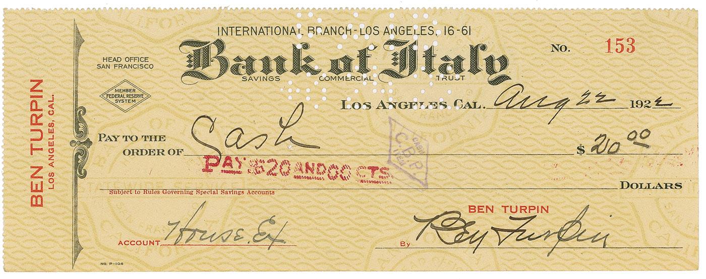 Bank check, 8.25 x 3.25, filled out and signed by Turpin, payable to Cash for $20.00, August 22, 1922. In fine condition, with two vertical folds, one passing through a letter of his signature, and expected cancellation holes and stamps. Pre-certified PSA/DNA and RRAuction COA.