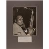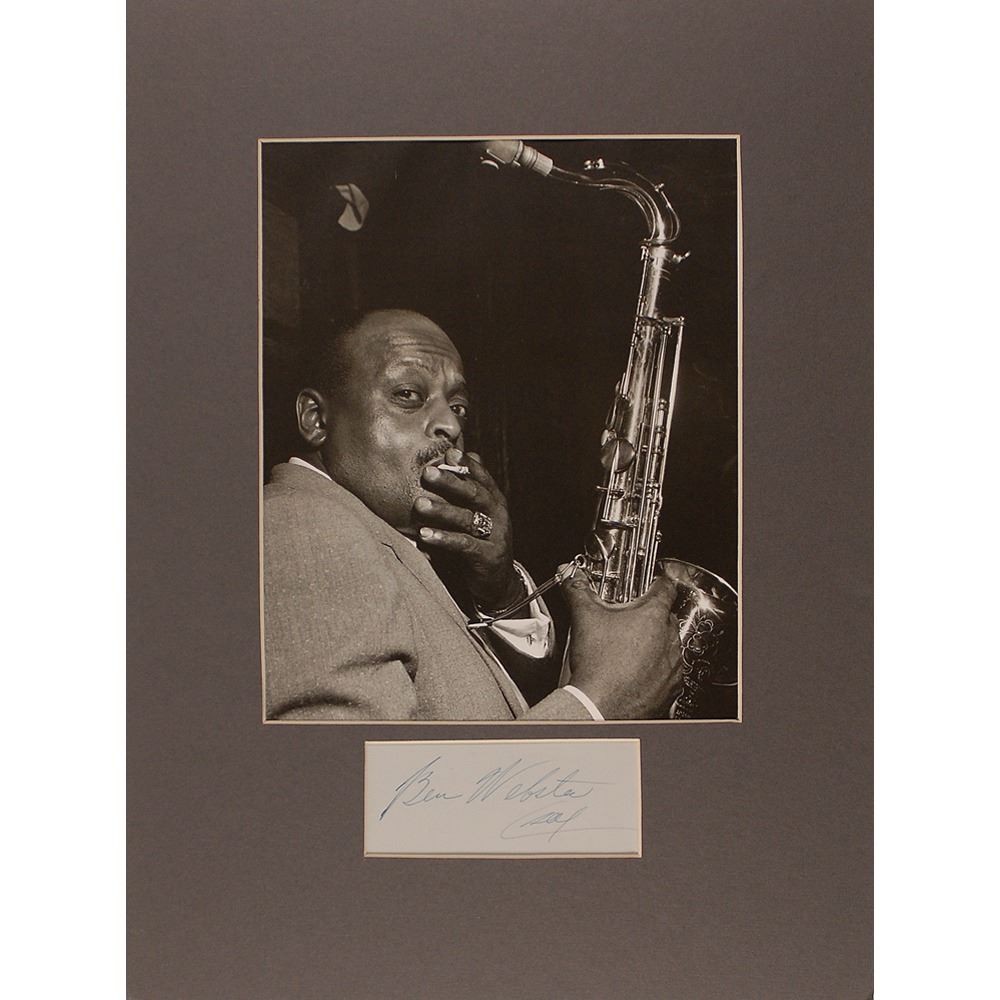 American jazz saxophonist (1909-1973) generally regarded, along with Coleman Hawkins and Lester Young, as one of the three greatest 'swing tenors.' Vintage fountain pen signature, "Ben Webster (sax)," on an off-white 4.75 x 2 album page. Matted with a book photo to an overall size of 13 x 17.5. In fine condition.