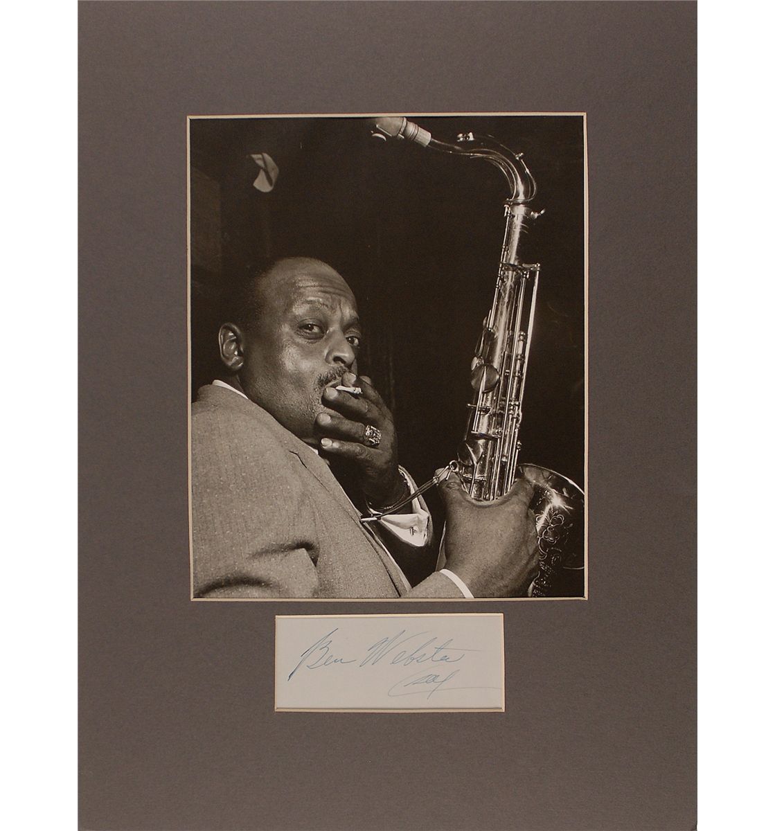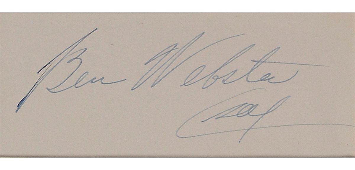 American jazz saxophonist (1909–1973) generally regarded, along with Coleman Hawkins and Lester Young, as one of the three greatest ‘swing tenors.’ Vintage fountain pen signature, “Ben Webster (sax),” on a light blue 4.75 x 2 album page. Matted with a book photo to an overall size of 13 x 17.5. In fine condition.