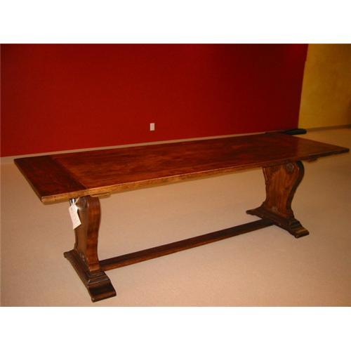 This fine hand made/bench made, hand carved, trestle table is clearly made by exceptional craftsmen .Along with several other wonderful reproduction pieces this table is a favorite as it is beautiful as well as functional and is so well aged and made that it holds its own next to any antique. The entire table is solid maple and aged, then finished with a hand polish to create a stunning patina.