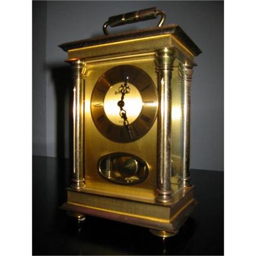 This vintage Carriage 8 inch, 8 day carriage mantle Clock indicated Chlenker Jr. Bench Mark and is made in W. Germany. It has Glass and brass with roman numeric and gorgeous shiny pendelum. The brass handle on the back opens and operates very well. It is in working It is marked and has a contemporary design.