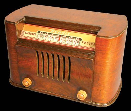 Bendix Standard Police Radio Model 0526E by Aviation Corp. Bow sides and bombay front, excellent condition. 12 1/2 X 7 1/2 X 7 inches.
