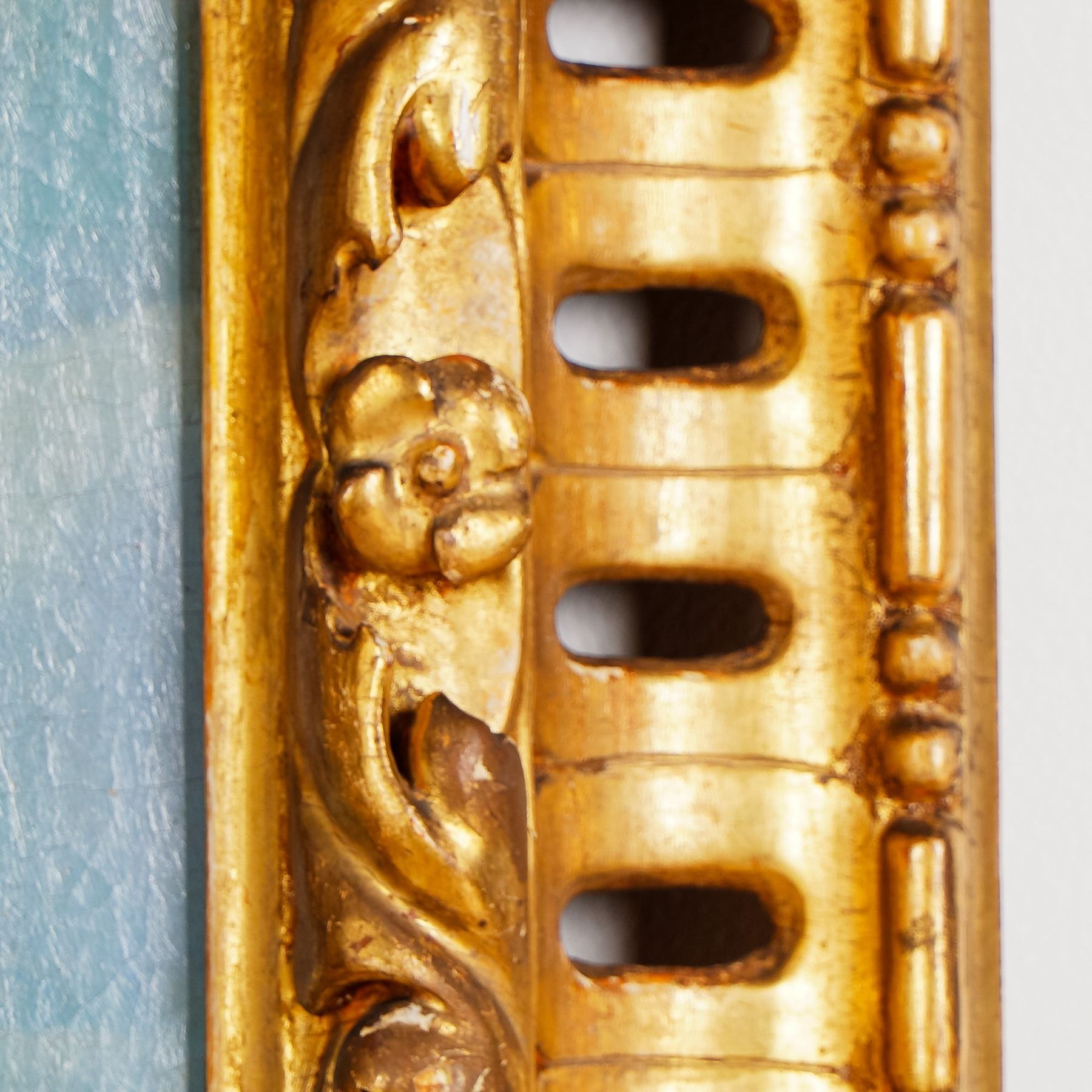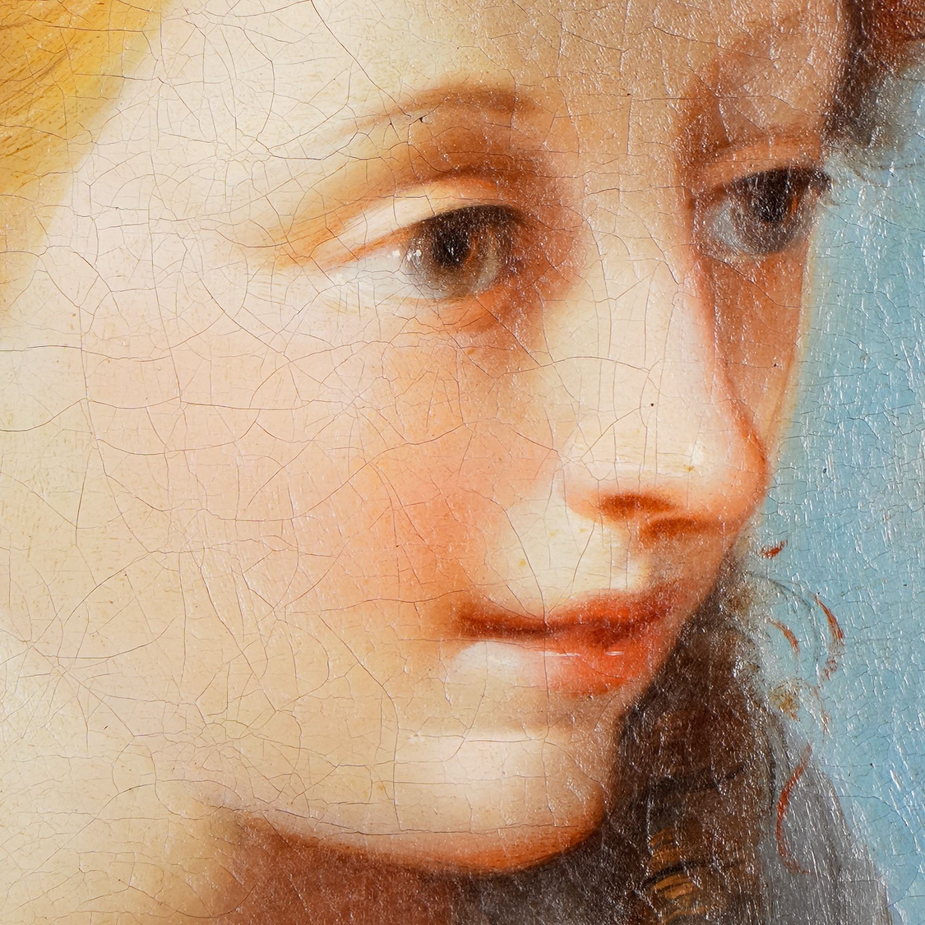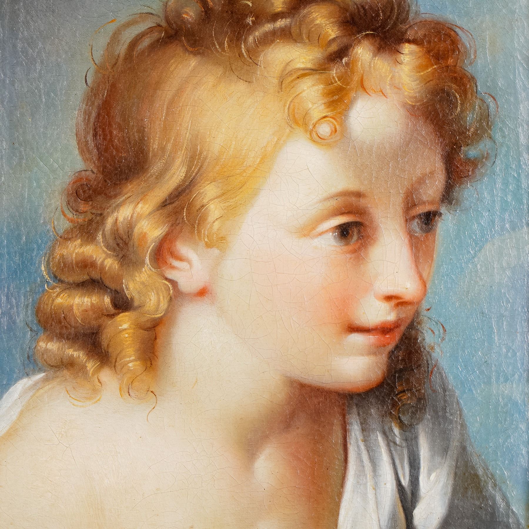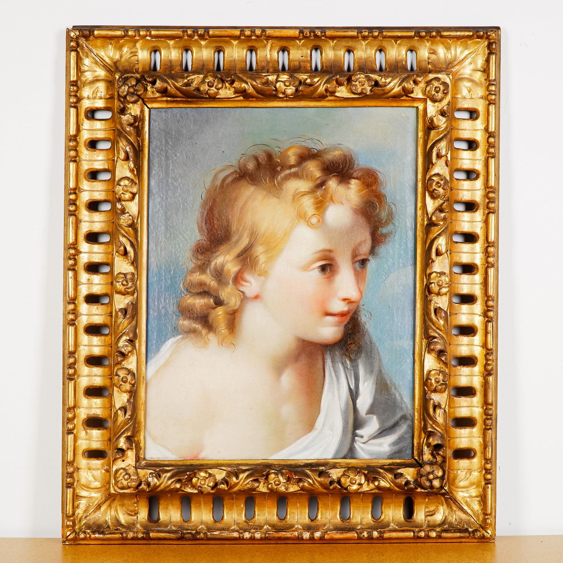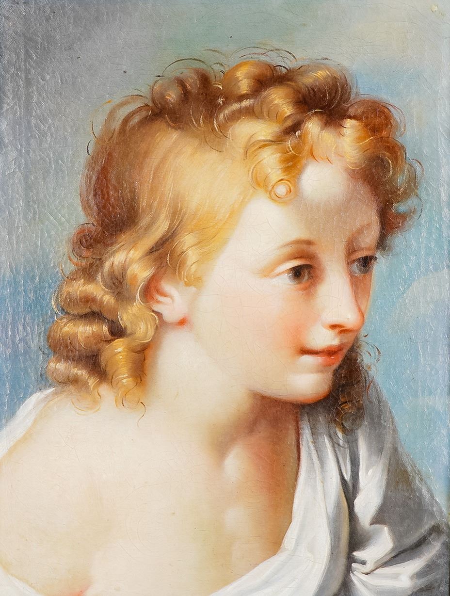 Exquisite oil on canvas portrait attributed to Benedetto Luti, the Italian Baroque master celebrated for his luminous handling of color and graceful rendering of youthful figures. This captivating work presents the tender profile of a young boy with golden curls and delicate features, bathed in soft light against a subtle sky-blue background. The painting displays a refined use of chiaroscuro and meticulous attention to skin tones, hallmarks of Luti's technique that drew admiration in Rome during the early 18th century. Benedetto Luti, born in Florence, rose to prominence in Rome where he became director of the prestigious Accademia di San Luca. Revered for his portraiture and pastel work, Luti's influence extended through his teaching and his patrons among Roman nobility and the papal court. His work bridges the transition from the grandeur of the High Baroque to a more intimate and lyrical sensibility. This portrait, with its sensitivity and glowing palette, is a fine representation of his artistic legacy. A compelling acquisition for collectors of Old Master paintings and Italian Baroque art. Set within an ornate giltwood frame richly decorated with floral and foliate carving, the portrait radiates both innocence and sophistication.