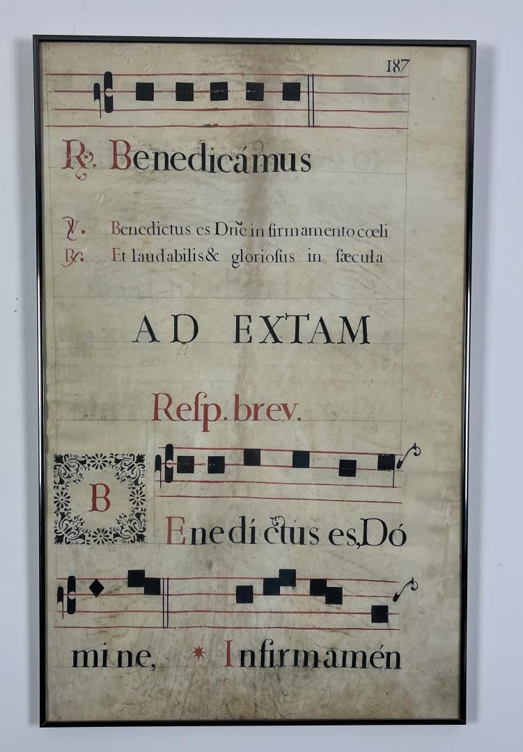 Nice early piece in frame, appears to be double sided. Illuminated vellum. Song is Benedicamus Domino. 20" by 31.5" framed.