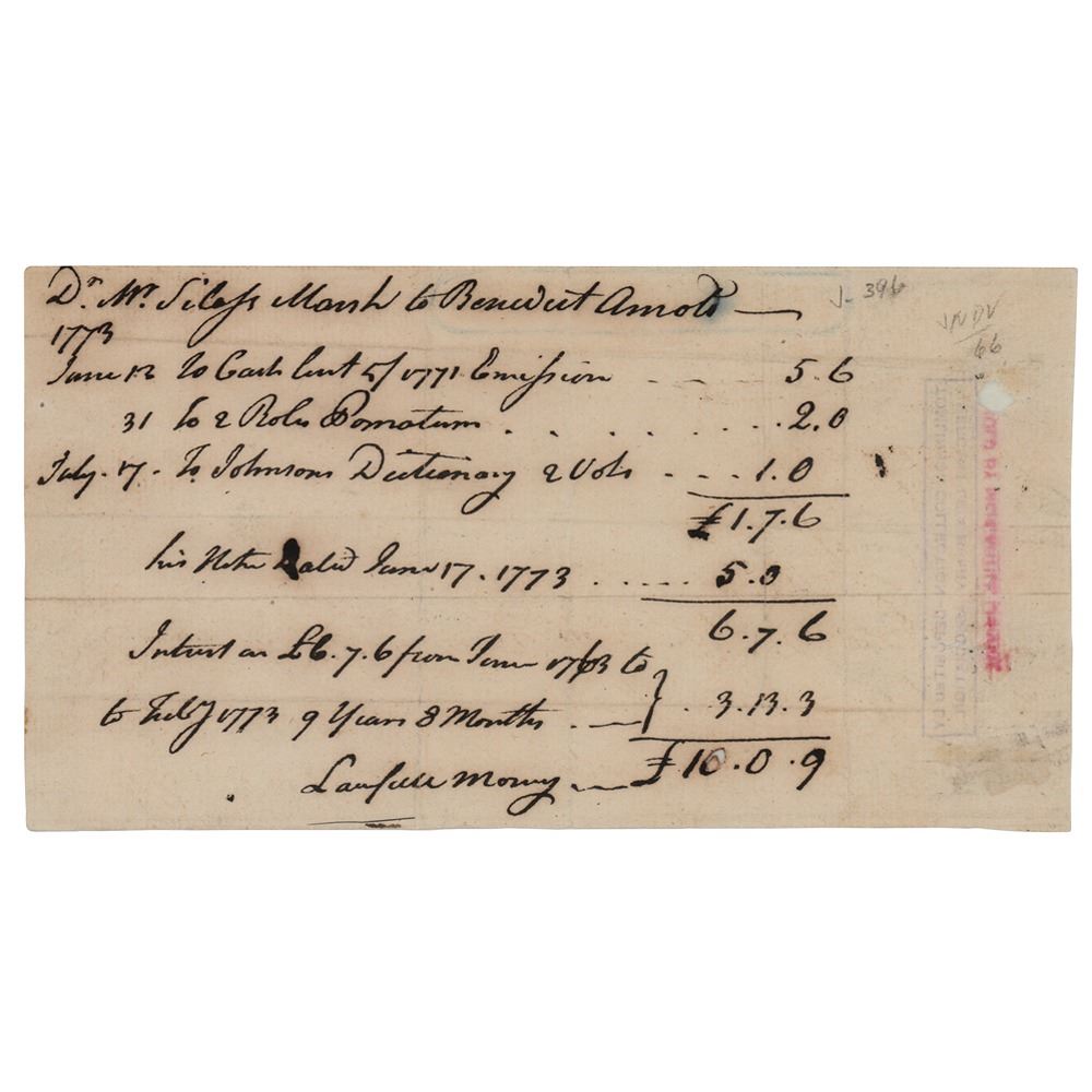 Major General in the Continental Army during the American Revolution who distinguished himself at Saratoga (1741-1801). One of Washington's most skilled and able generals, he turned traitor in an infamous plot to turn over the fortress at West Point to the British. Third-person ADS, one page, 7.25 x 4, June–July 1773. Handwritten financial document by Benedict Arnold, headed "Dr. Mr. Silas Marsh to Benedict Arnold," detailing money lent and interest paid, amounting to a total of £10.0.9. The most notable line item is "Johnson's Dictionary, 2 Vols.," sold for £1, evidently an early edition of Samuel Johnson's influential Dictionary of the English Language. In fine condition, with a small hole to the right margin. Accompanied by a full letter of authenticity from JSA.