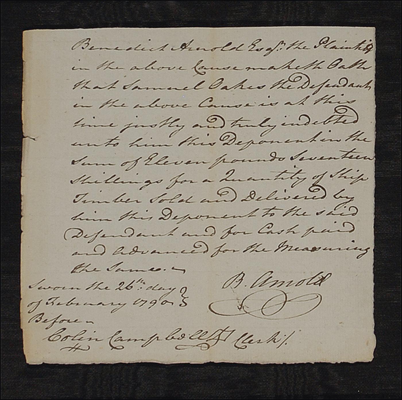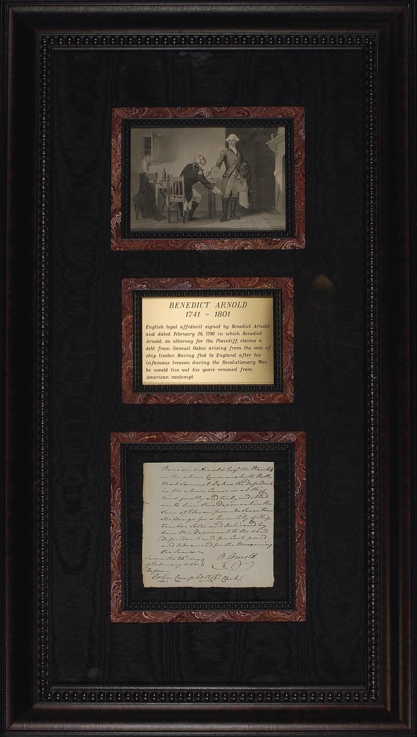 One of the most well-known traitors in history, Benedict Arnold (1741-1801) was a successful general from Connecticut during the Revolutionary War, up until he switched sides and got caught trying to help the British in 1780. Manuscript DS, signed “B. Arnold,” one page, 6 x 6, February 26, 1790. Legal affidavit reads, in full: “Benedict Arnold Esqr of the Plaintiff in the above cause maketh oath that Samuel Oakes the Defendant in the above cause is at this time justly and truly indebted unto him Deponent in the Sum of Eleven Pounds Seventeen Shillings for a quantity of Ship Timber sold and Delivered by him this Deponent to the said Defendant and for Cash paid and advanced for the measuring the Same.” Very nicely double cloth matted and framed with a portrait of Arnold and George Washington, and a descriptive plaque, to an overall size of 20 x 35.5. In fine condition, with light intersecting folds, a few mild strips of toning, and some scattered light edge wear.