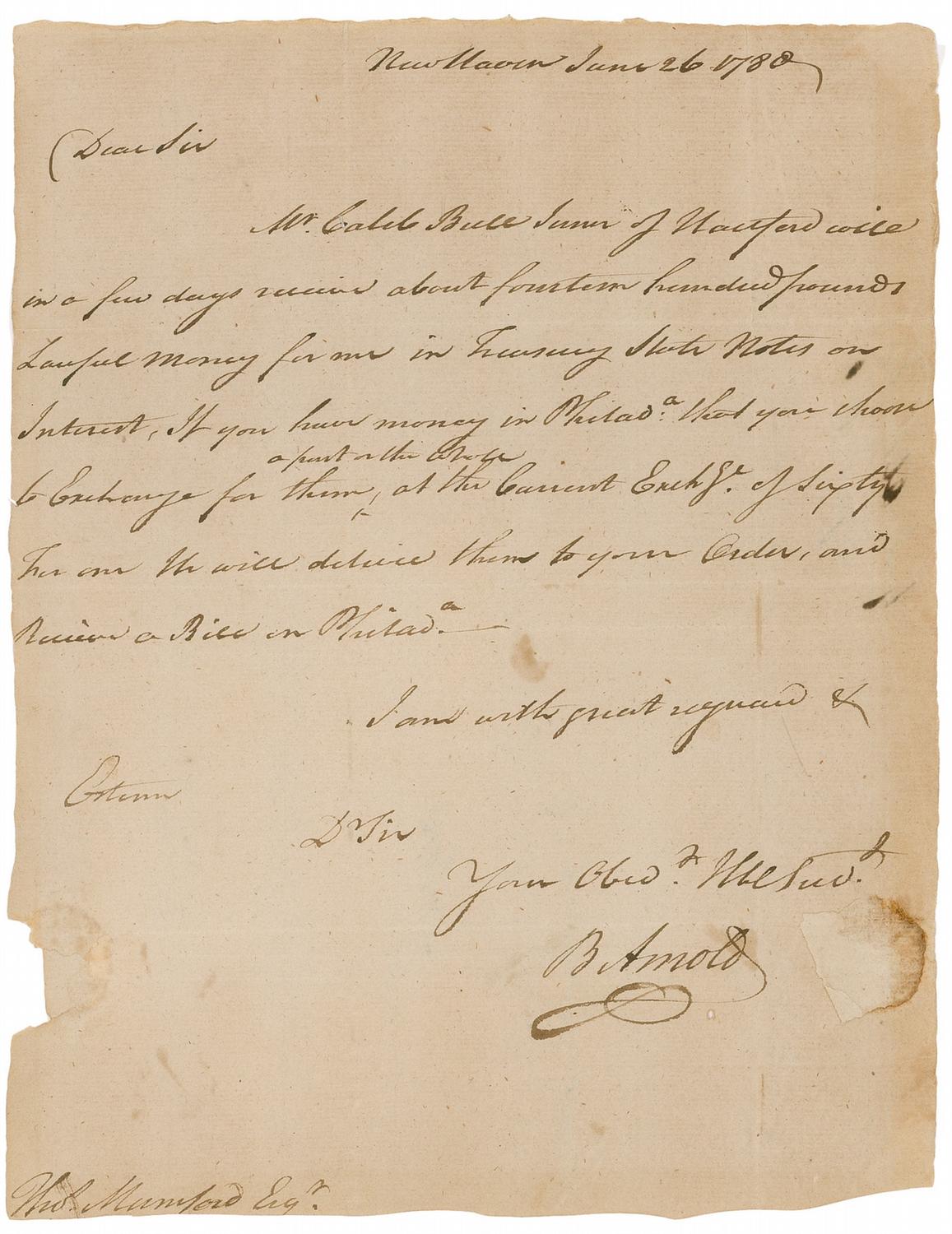 One of the most well-known traitors in history, Benedict Arnold (1741-1801) was a successful general from Connecticut during the Revolutionary War, up until he switched sides and got caught trying to help the British in 1780. ALS signed “B. Arnold,” one page, 7.5 x 9.75, June 26, 1780. Letter to Thomas Mumford. In full: “Mr Caleb Bull Junr of Hartford will in a few days receive about fourteen hundred pounds Lawful money for me in Treasury Stock Notes on Interest. If you have money in Philad:a that you choose to Exchange for them, a part or the whole, at the Current Exchge. of Sixty per one. He will deliver them to your Order, and receive a Bill in Philad.a.” Reverse bears an address panel to Mumford, written by Arnold, and has also been docketed, presumably by Mumford, “Genl Arnold, 26 June 1780.” In very good condition, with intersecting folds, one directly above signature, scattered toning and soiling, and paper loss to left edge from the wax seal (which is still present to the right of Arnold’s signature).