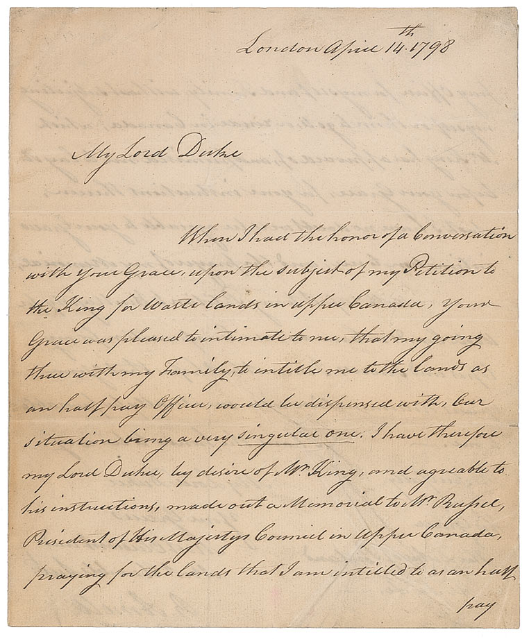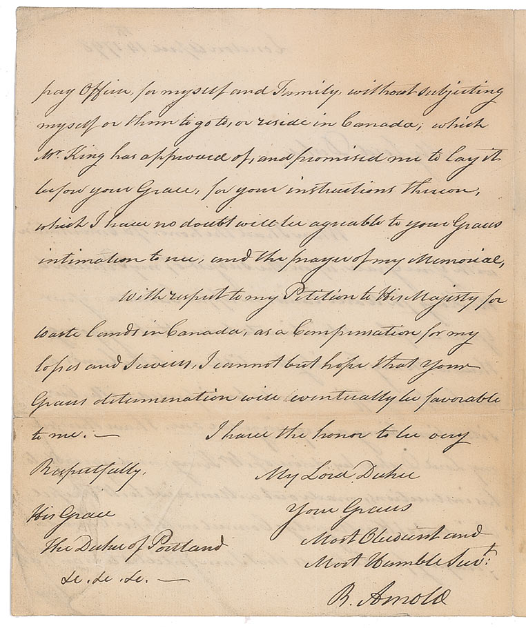ALS signed “B. Arnold,” one page both sides, 7.25 x 8.75, April 14, 1798. From London, Arnold writes the Duke of Portland. In part: “When I had the honor of a Conversation with Your Grace upon the subject of my Petition to the King for Waste lands in upper Canada, Your Grace was pleased to intimate to me that my going there with my Family to intitle [sic] me to the lands as an half pay Officer, would be dispensed with, our situation being a very singular one. I have therefore my Lord Duke, by desire of Mr. King, and agreeable to his instructions, made out a Memorial to Mr. Bupel, President of His Majesty’s Council in Upper Canada, praying for the lands that I am intitled [sic] to as an half pay officer for myself and my family without subjecting myself or them to go to, or reside in Canada, which Mr. King has approved of, and promised me to lay it before Your Grace for your instructions thereon, which I have no doubt will be agreeable to Your Grace intimation to me, and the prayer of my Memorial.” Intersecting horizontal and vertical folds, wrinkles, scattered light toning, and an adjacent page reinforced, otherwise fine condition.