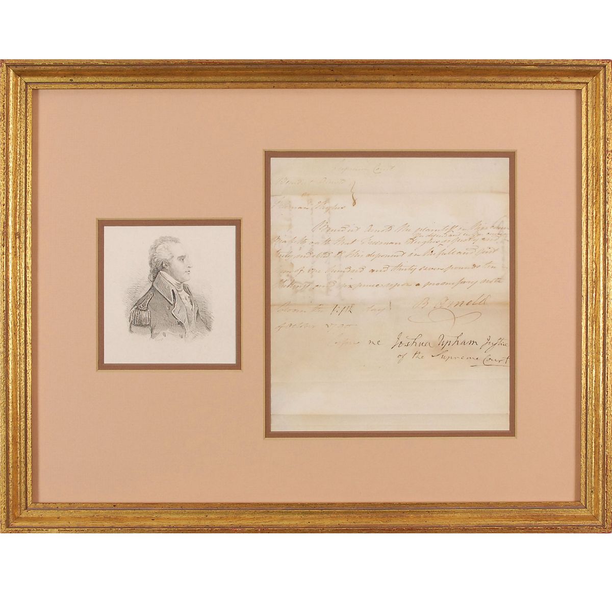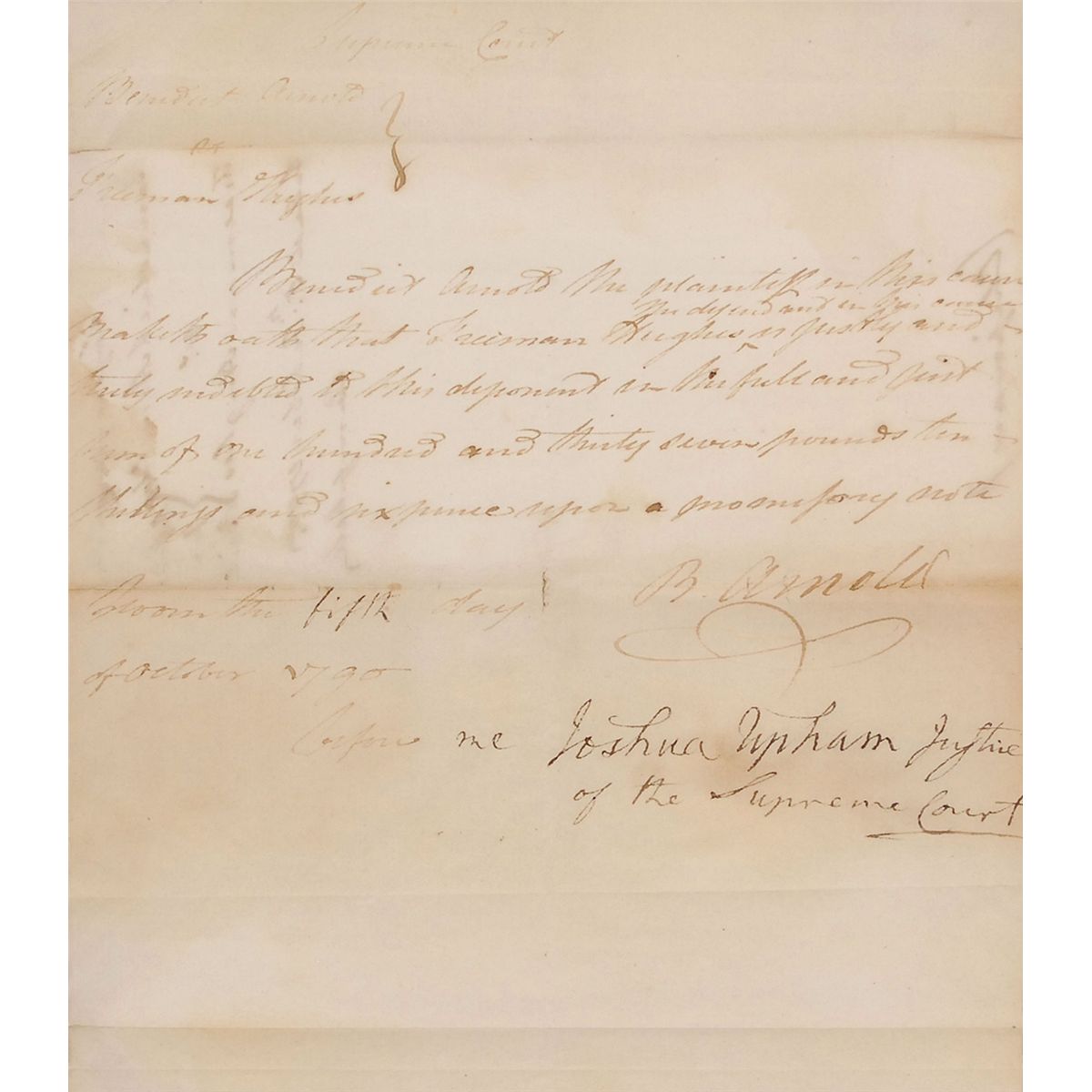 Manuscript DS, signed “B. Arnold,” one page, 7 x 8, October 5, 1790. A legal document in which “Benedict Arnold the plaintiff in this cause maketh oath that Freeman Hughes…is justly and truly indebted to this deponent in the…sum of one hundred thirty seven pounds, ten shillings and sixpence.” Signed at the conclusion by Arnold and countersigned by Joshua Upham, a judge in the Supreme Court of New Brunswick, Canada. In fine condition, with intersecting folds (a horizontal fold passing through the signature), some light dampstaining, and show-through from docketing to reverse. Arnold moved to Saint John, New Brunswick, in 1785, where he established a business doing trade with the West Indies; he became thoroughly disliked in the area due to a series of bad business deals and legal battles—this document certainly pertaining to one. Both Loyalists and Americans turned against him, and after winning a slander suit against a former business partner, the townspeople burned him in effigy in front of his house as his family watched. After six years of controversy and resentment, Arnold returned to London in December 1791. Benedict Arnold documents are scarce and always desirable, this example being especially so as it relates to his sordid legacy in the Americas.