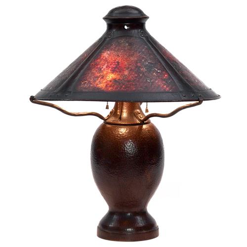 Good Benedict Studio table lamp, attribution, hammered copper base and shade with original mica, original sockets, fine original patina,20in.dia., 23in.h;with an Arts and Crafts candlestick, (not shown), hammered copper with four buttresses, original pati