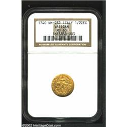 Benedict XIV Gold 1/2 Zecchino 1740, KM-932 MS63 NGC, Papal arms reverse with legend DEDIT PIGNVS. Important notice: We expect to be auctioning lots at the rate of 200-250 per hour. Sometimes eBay Premier live bid software cannot keep up with that pace, so we strongly recommend that you place a realistic proxy bid now as insurance to avoid disappointment. Also please note that all Heritage/CAA lots purchased through eBay Premier carry a 20% Buyer's Premium. Please make sure you read the Terms and Conditions.