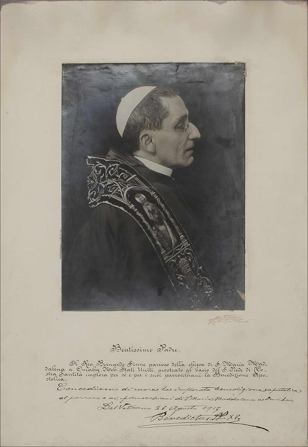 Pope, born Giacomo della Chiesa (1854–1922), who reigned from 1914 until his death. Benedict’s pontificate was dominated by World War I, which he termed “the suicide of Europe,” and its turbulent aftermath. Maintaining strict neutrality, he advanced several peace proposals and did much to aid war victims. Impressive manuscript apostolic blessing, in Italian, signed “Benedictus PP. XV,” 18 x 26.25, dated August 26, 1917. Blessing is presented to Reverend Bernardo Sinne, and features a 10.75 x 14.5 profile portrait of the Holy Father. In fine condition, with overall silvering to photo, and some scattered light toning and soiling to edges. Benedict’s bold signature measures an impressive 8” long.