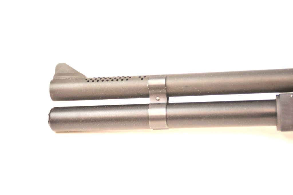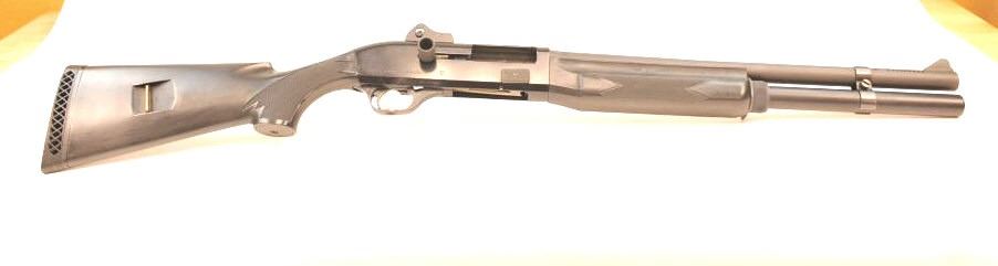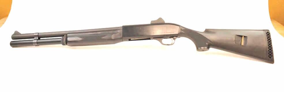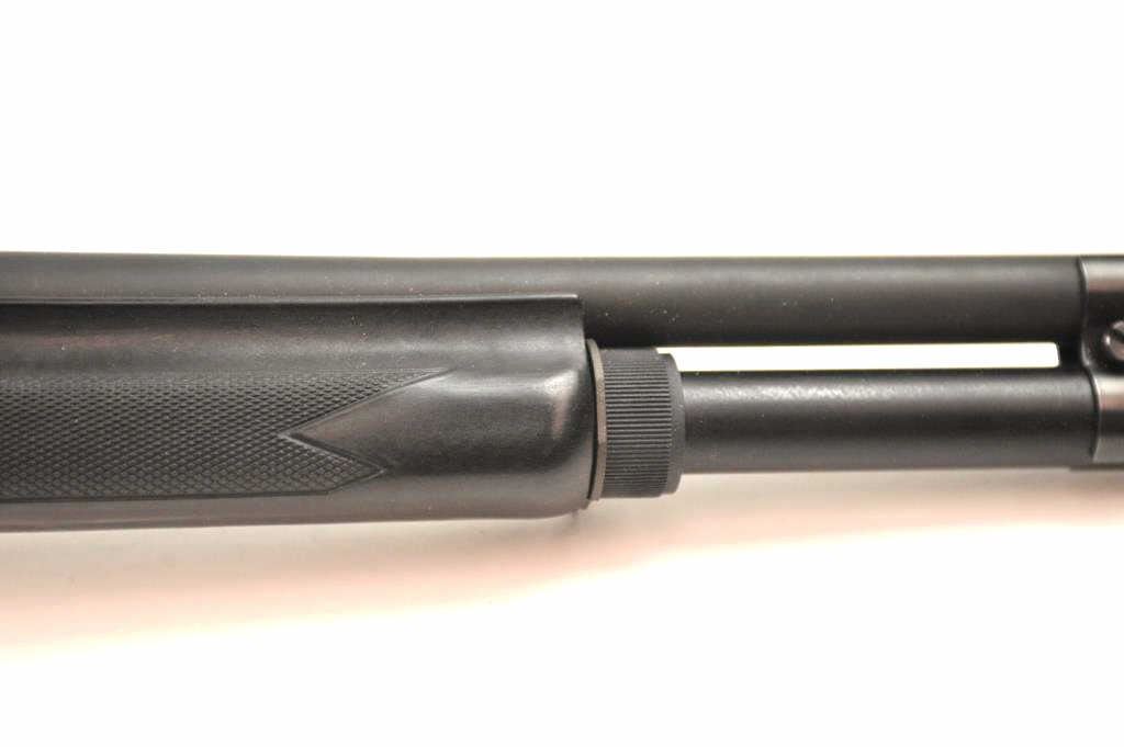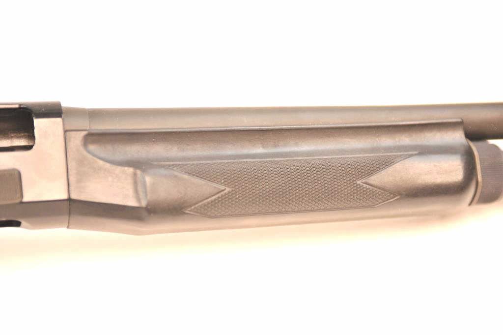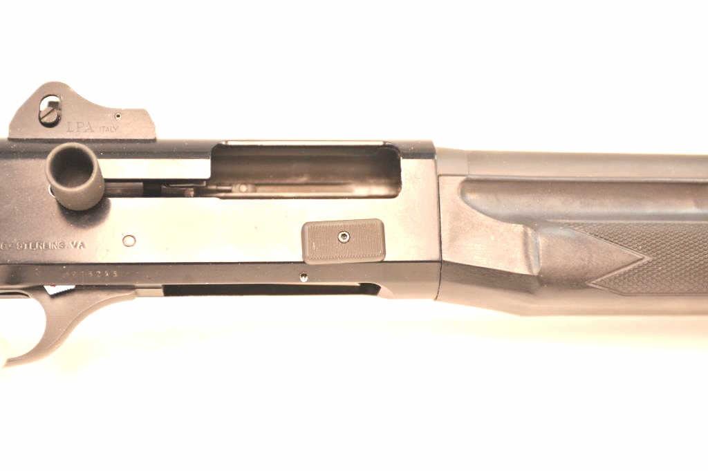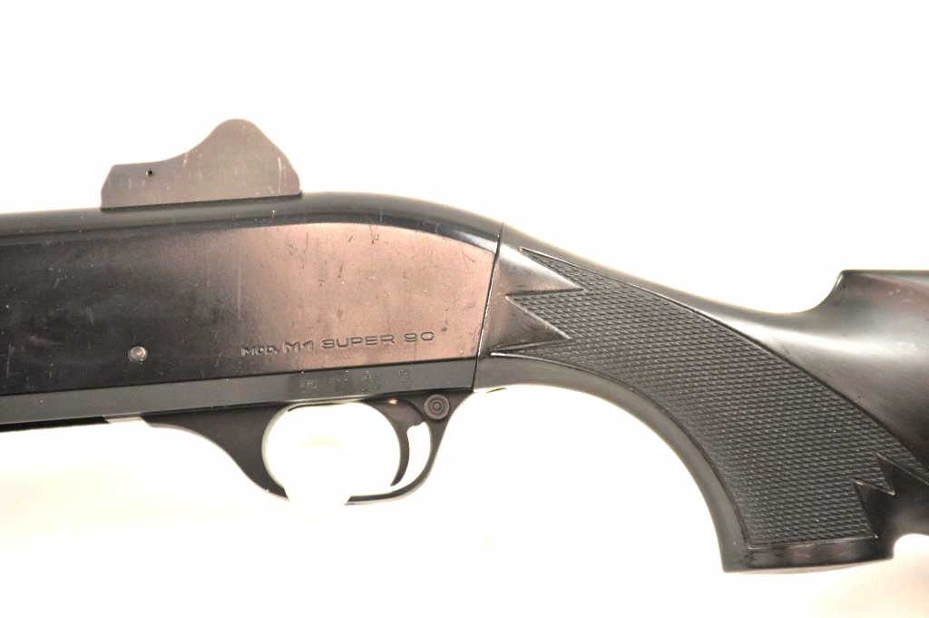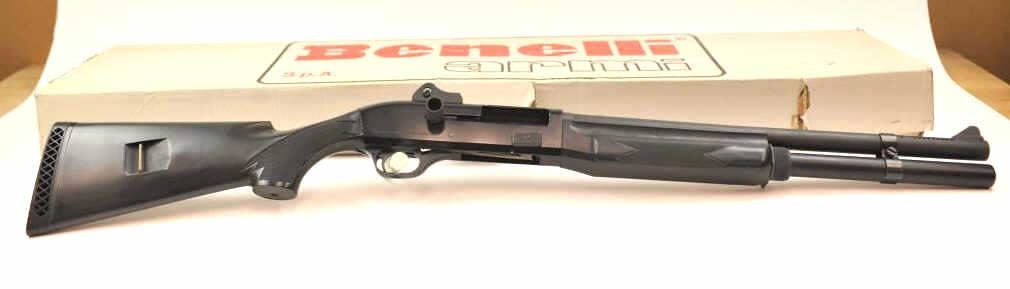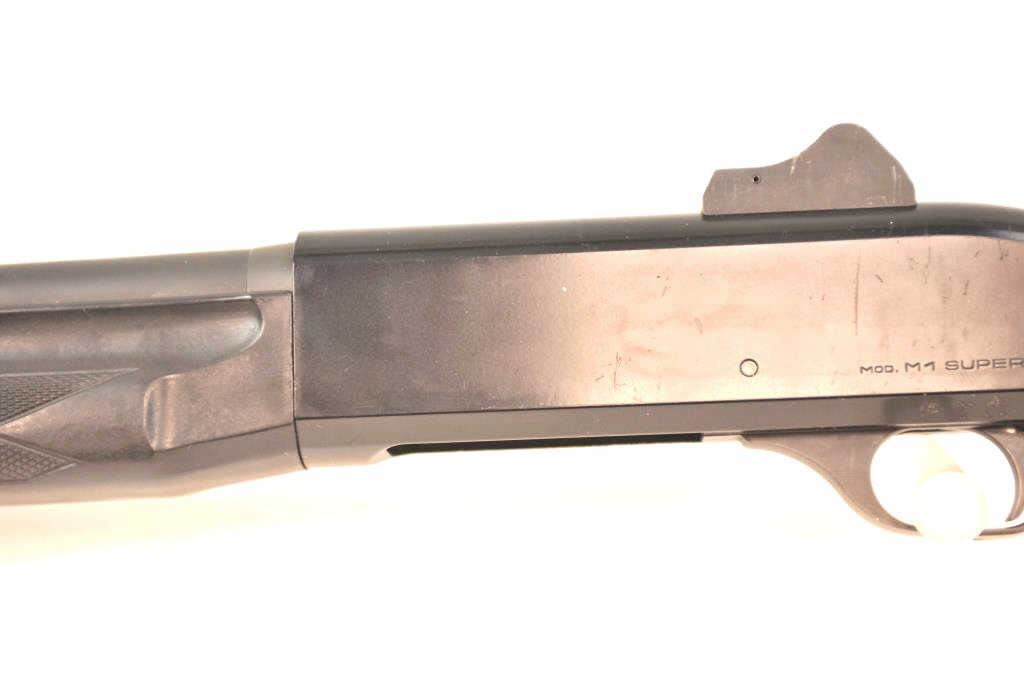Benelli M1 Super 90 semi-automatic shotgun, 12 gauge, Serial #M075235. The shotgun is in fine overall condition with a 19” compensated barrel with a full-length extended magazine. The shotgun retainsnearly all of the matte blue finish with rifle sights. The synthetic stock is in very good condition and ends with a ventilated rubber recoil pad providing a 14 ¼” LOP. The bore is good, the action is crisp and themarkings are sharp on this desirable Benelli with a compensated barrel. Est.: $700-$1,400. (Modern).
