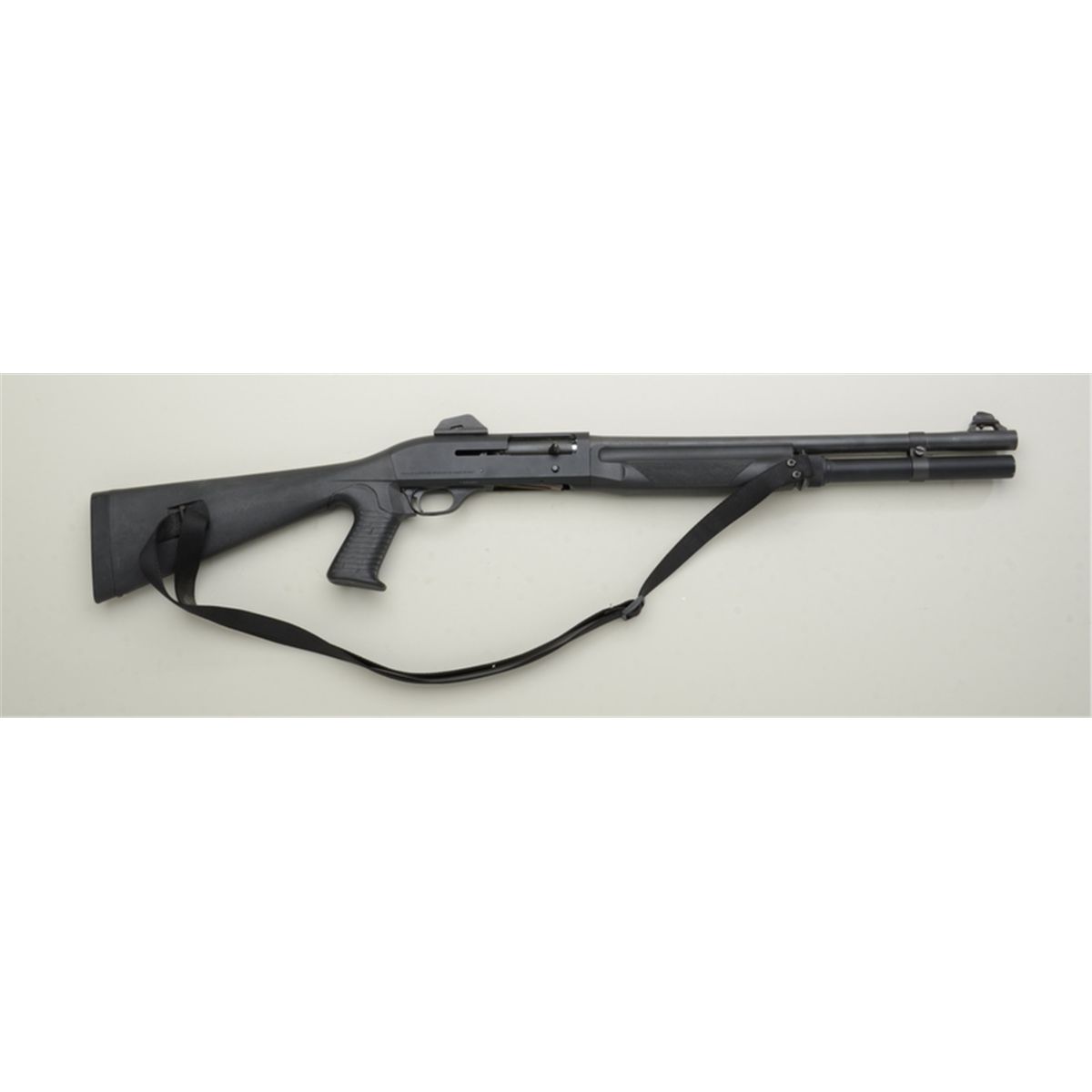 Benelli Model M1 Super 90 semi-auto shotgun, 12 gauge, 18-1/2” barrel, mat black finish, checkered composite black stocks, #M206954. This gun is in overall excellent condition showing little handling or use, mirror bore,crisp action, fine stocks, extended magazine, woven black sling; in factory cardboard shipping box with short magazine adapter. Est.: $500-$1,000.