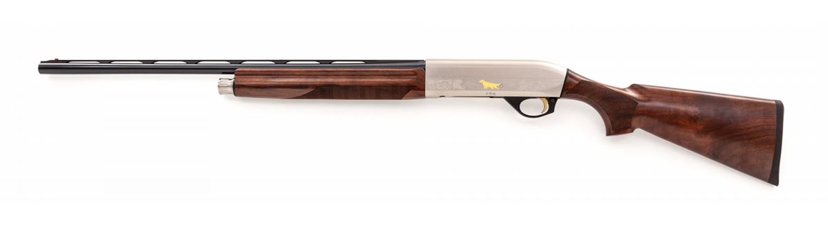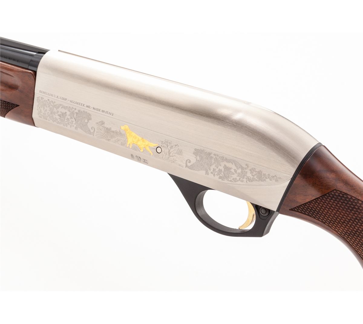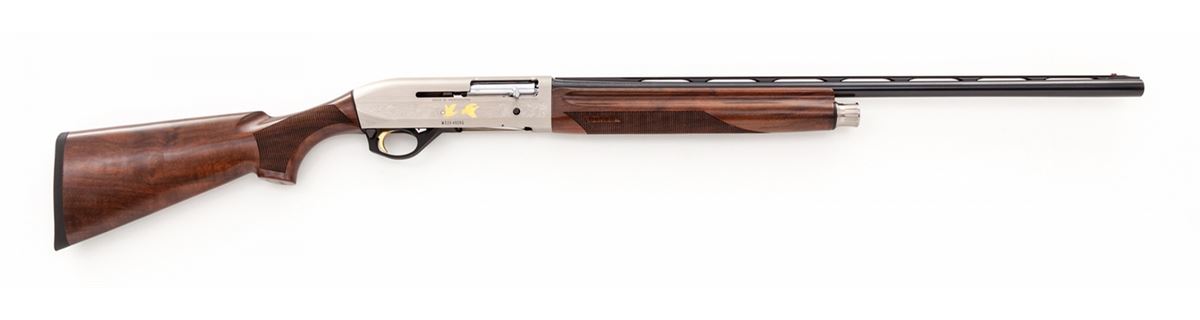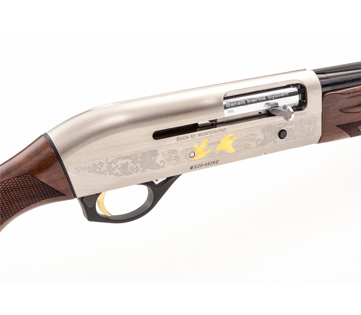Benelli Montefeltro Semi-Automatic Shotgun, #S20-4026Q, 20 ga., 26'' vent rib barrel with Benelli Criochokes, coin finish with applied gold game scenes, factory checkered walnut stock, in original case with all accessories and paperwork. Condition is excellent, appearing as new and unfired. Est.: $1,000-$1,500. (Modern)