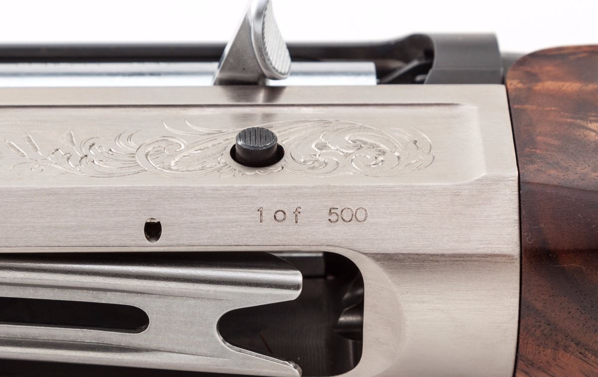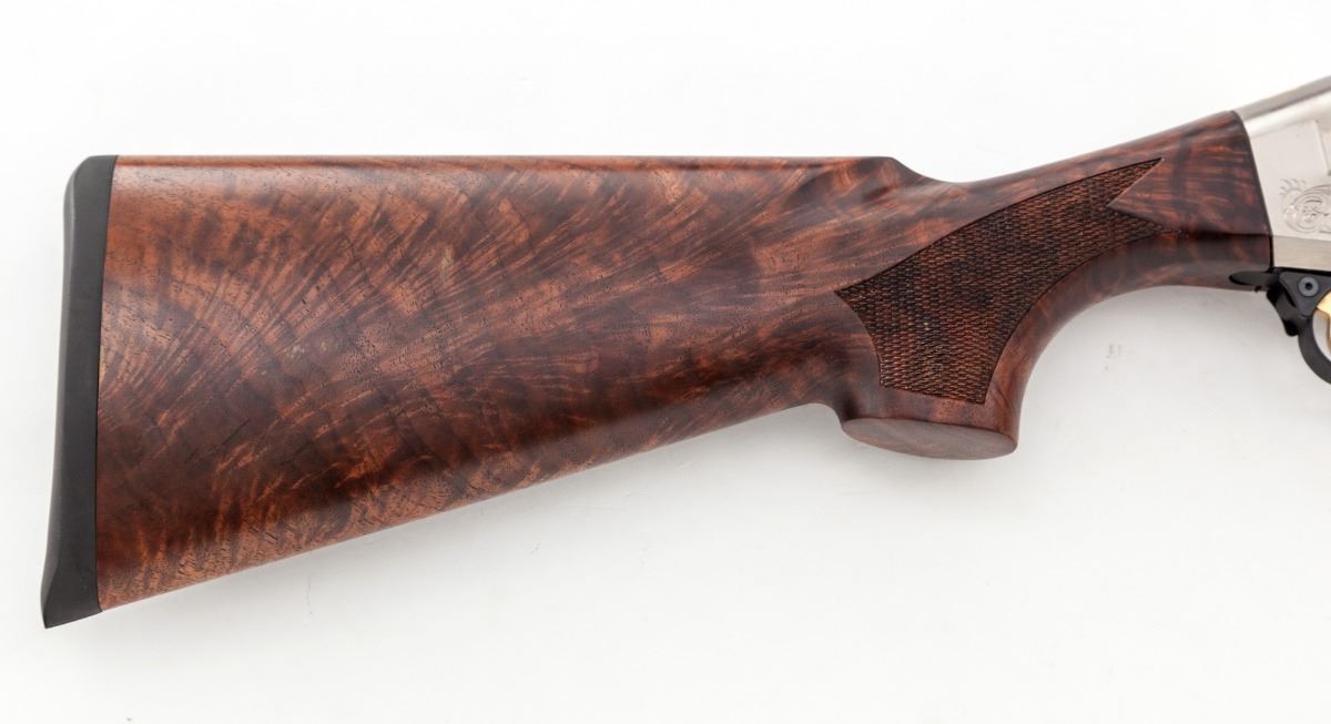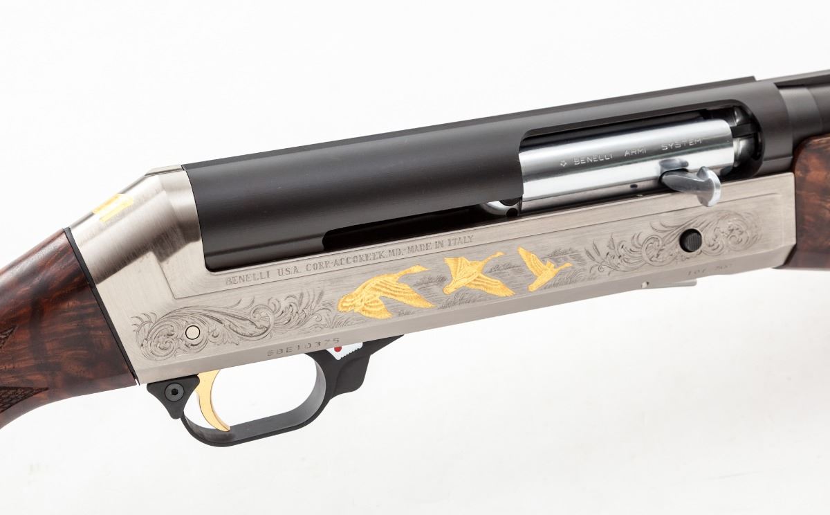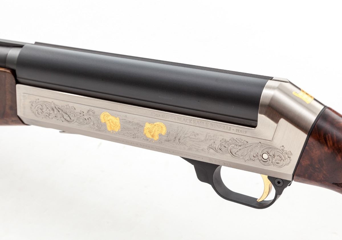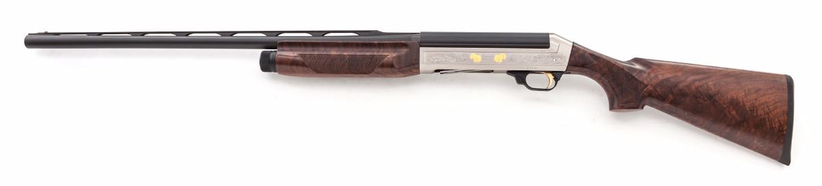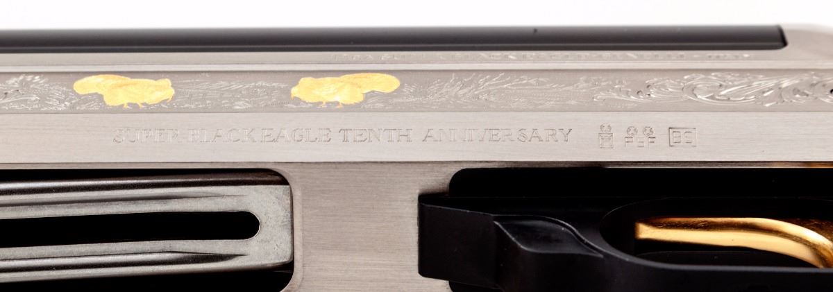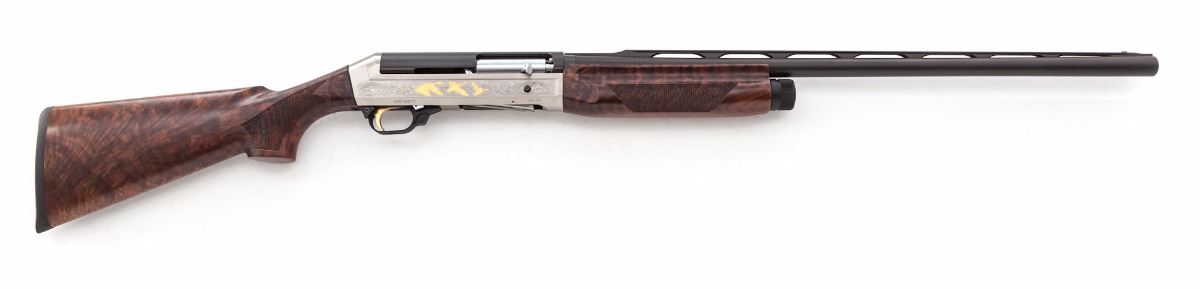 Benelli Super Black Eagle Semi-Automatic Shotgun, 10th Anniversary Limited Edition 1 of 500, #SBE10375, 12 ga. with 3-1/2'' chambers for 2-3/4'', 3'' & 3-1/2'' shells, 25.5'' gloss-blued vent rib barrel, nickel-plated and engraved receiver with gold inlaid turkeys on one side and birds in flight on the other; AAA Grade oil-finished American checkered walnut stock and forend. Additionally engraved ''Super Black Eagle Tenth Anniversary'' on left and ''1 of 500'' on right. In original Benelli hard case with assoc. paperwork, choke tubes and tool. Only 500 mfg'd in Italy in 2002. Condition is excellent, appearing as new and unfired. Est.: $1,800-$2,400. (Modern)