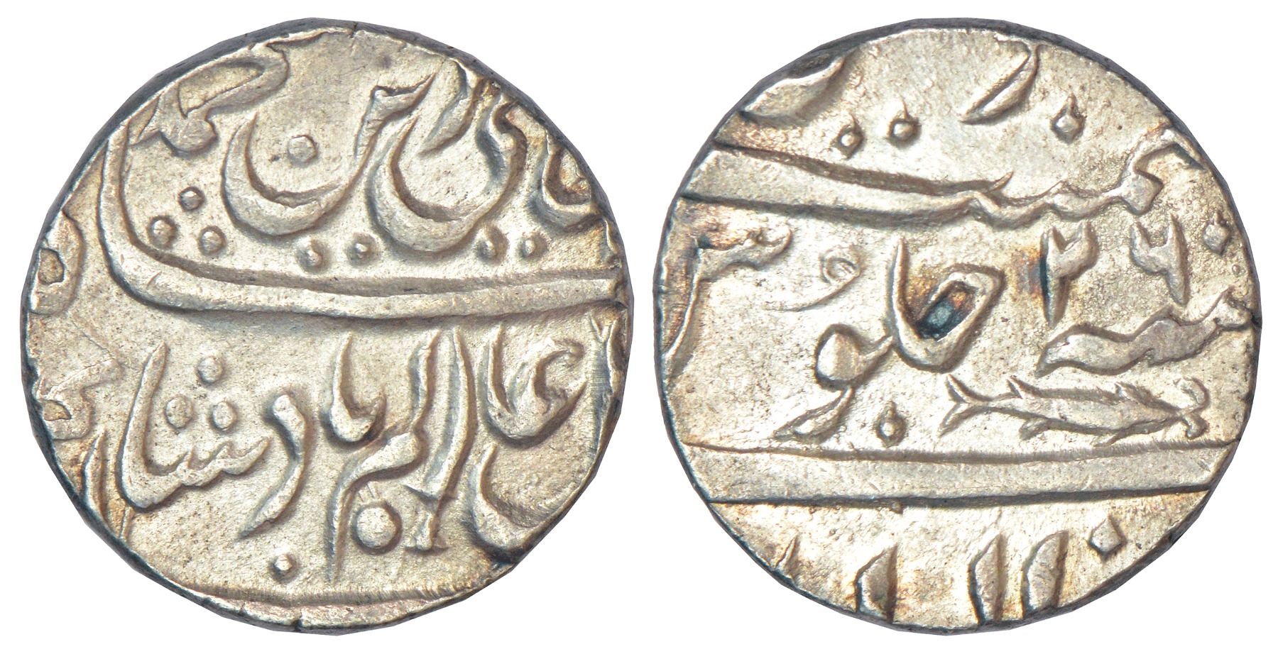Bengal Presidency, Allahabad, silver rupee, in the name of Shah Alam II, RY 26, Stevens EIC 8.7, 11.19g, sword and ball mintmark on obverse and fish mintmark on reverse.