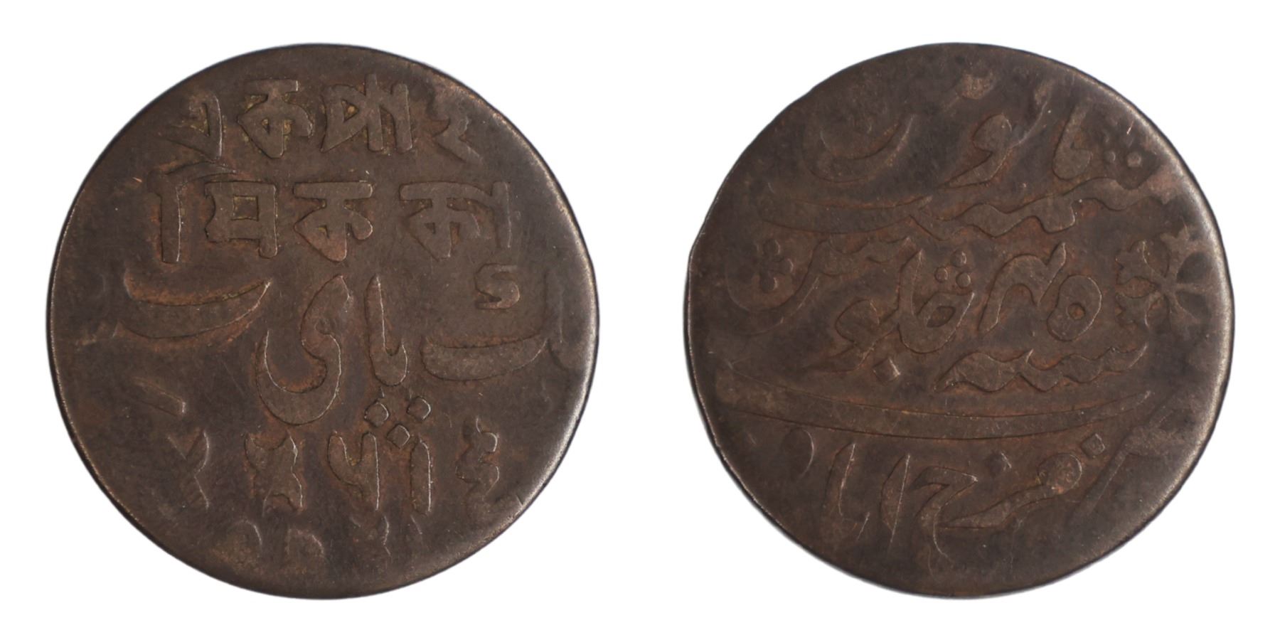 INO Shah Alam II, RY 45, Copper Pattern Pice, 1806 (Mule Issue), Farrukabad Mint, 6.56g, 26.20mm, P. Stv-8.117, Prid-342.A copper pattern prepared by Forster, featuring the value in three languages on the Obverse: Bengali: à¦à¦• পয় সিকà§à¦•া (ek pai sikka) | Persian: یک پای Ø³Ú©Û (yek pai sikka) | Hindi: à¤à¤• पई सिकà¥à¤•ा (ek pai sikka). Reverse: bears the Persian inscription: ẓarb farruckÄbÄd sanah 45 julÅ«s maimanat mÄnÅ«s& nbsp;(Struck at Farrukhabad in the 45th year of his reign of tranquil prosperity). Very Fine+, Extremely Rare.Notes: This experimental pattern issue represents a mule pairing of mismatched dies, making it a highly important numismatic anomaly from the late Mughal period and its pattern status suggests a trial striking rather than a circulation issue. Pieces of this type from FarrukhÄbÄd are seldom encountered and the combination of pattern fabric, mule configuration and advanced regnal year places this specimen among the most desirable and elusive varieties for collectors of Indo-Mughal and late Mughal experimental coinage. Of the highest rarity (RRR) and among the rarest known copper issues from Farrukhabad.
