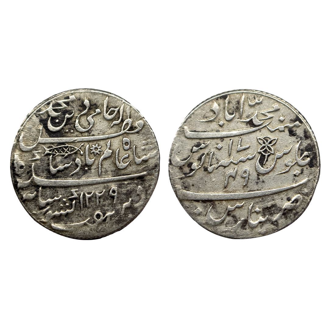 Bengal Presidency, Muhammadabad Banaras Mint, Silver Rupee, 11.30Grms, in the name of Shah Alam II, AH 1229/17/49, a complete horizontal fish and star on obv., 1815 New issue, oblique milling (Prid # 289). Very Fine.