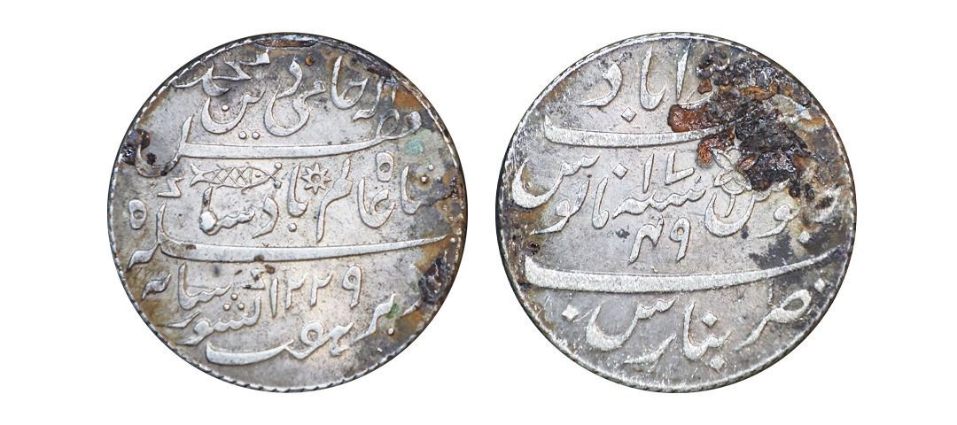 Bengal Presidency, Muhammadabad Banaras Mint, Silver Rupee, 11.42 gms, AH 1229, RY 17/49, In the name of Shah Alam II, KM # 42, very fine+, very scarce.