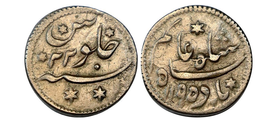Bengal Presidency, The Bengal Presidency ½ Anna coin, known as the Princep Issue, was struck at the Calcutta Mint (likely the Fulta Mint) during the reign of Shah Alam II, dated AH 1195 (1781) with regnal year 22. It is a copper coin with a weight 14.28g, Fine+.