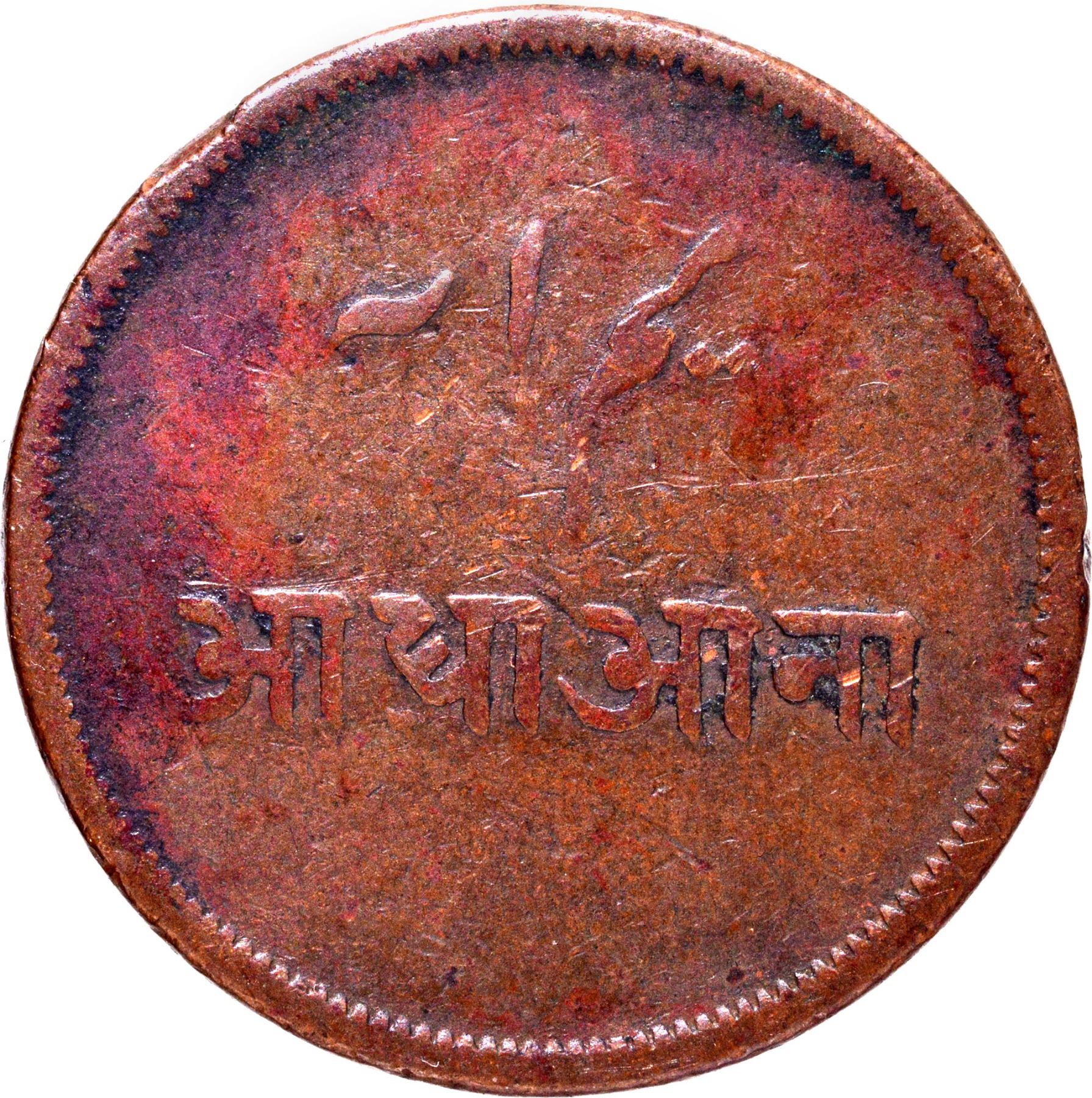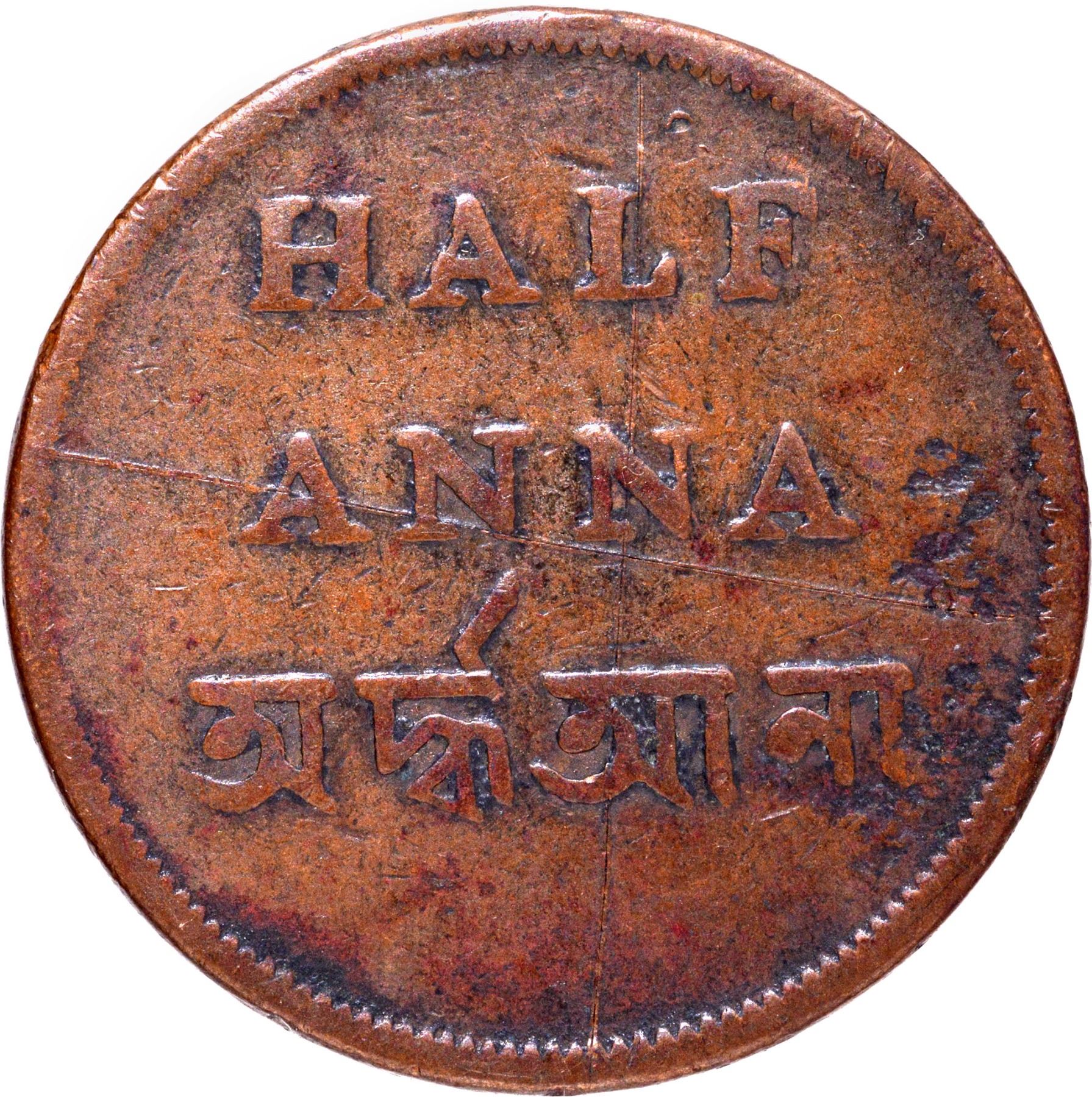 Bengal Presidency, Calcutta Mint, Copper Half Anna, Obv:value in Persian and Nagari, Rev:value in English and Bengali, 12.21g, 27.47mm, (KM # 59/Stevens # 9.29), about very fine, Scarce.