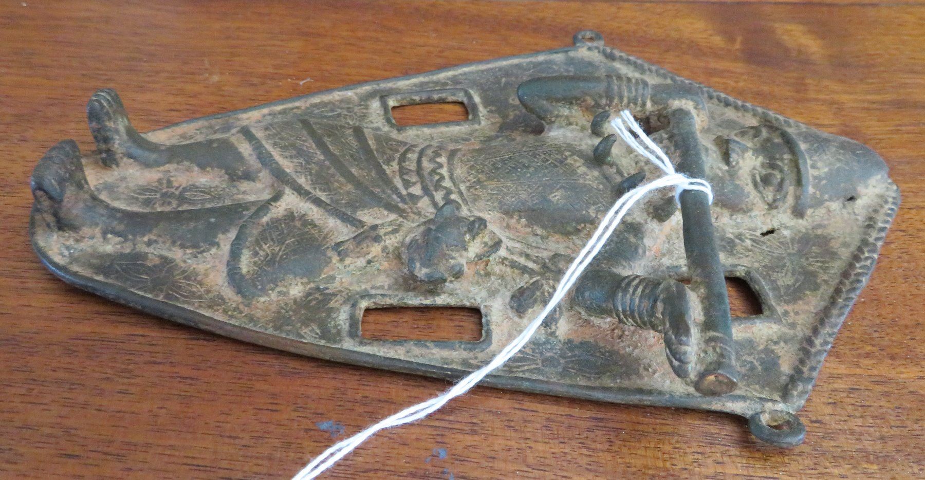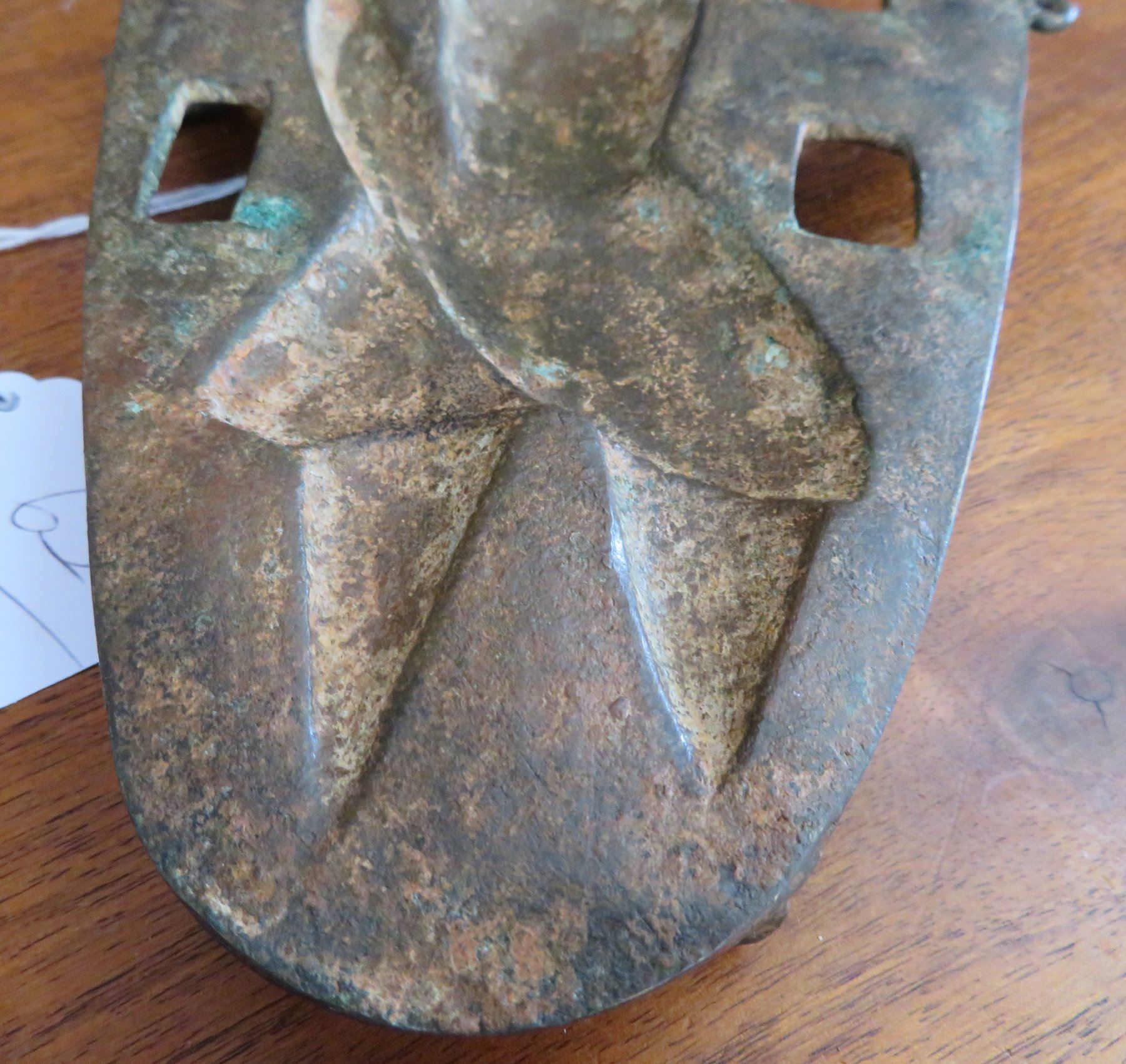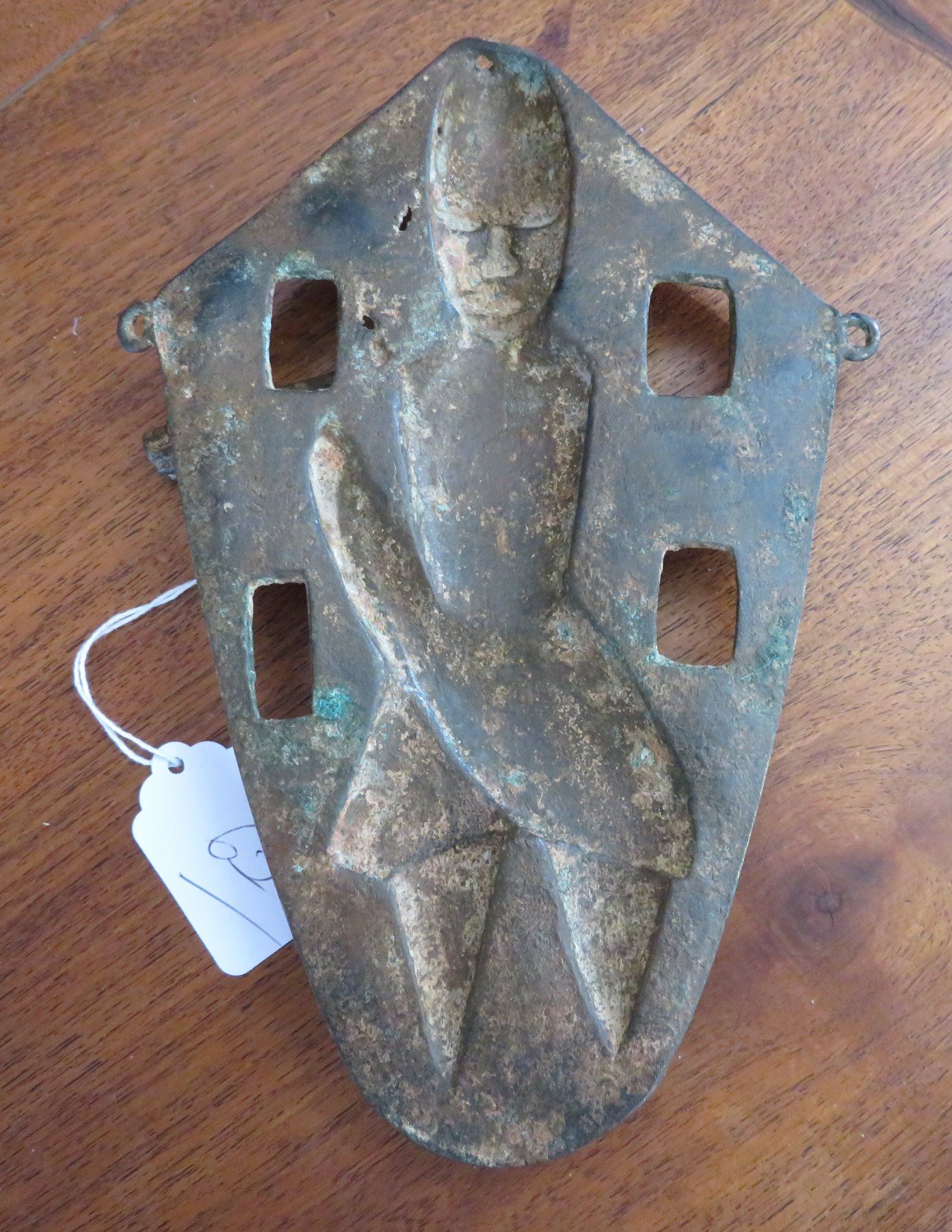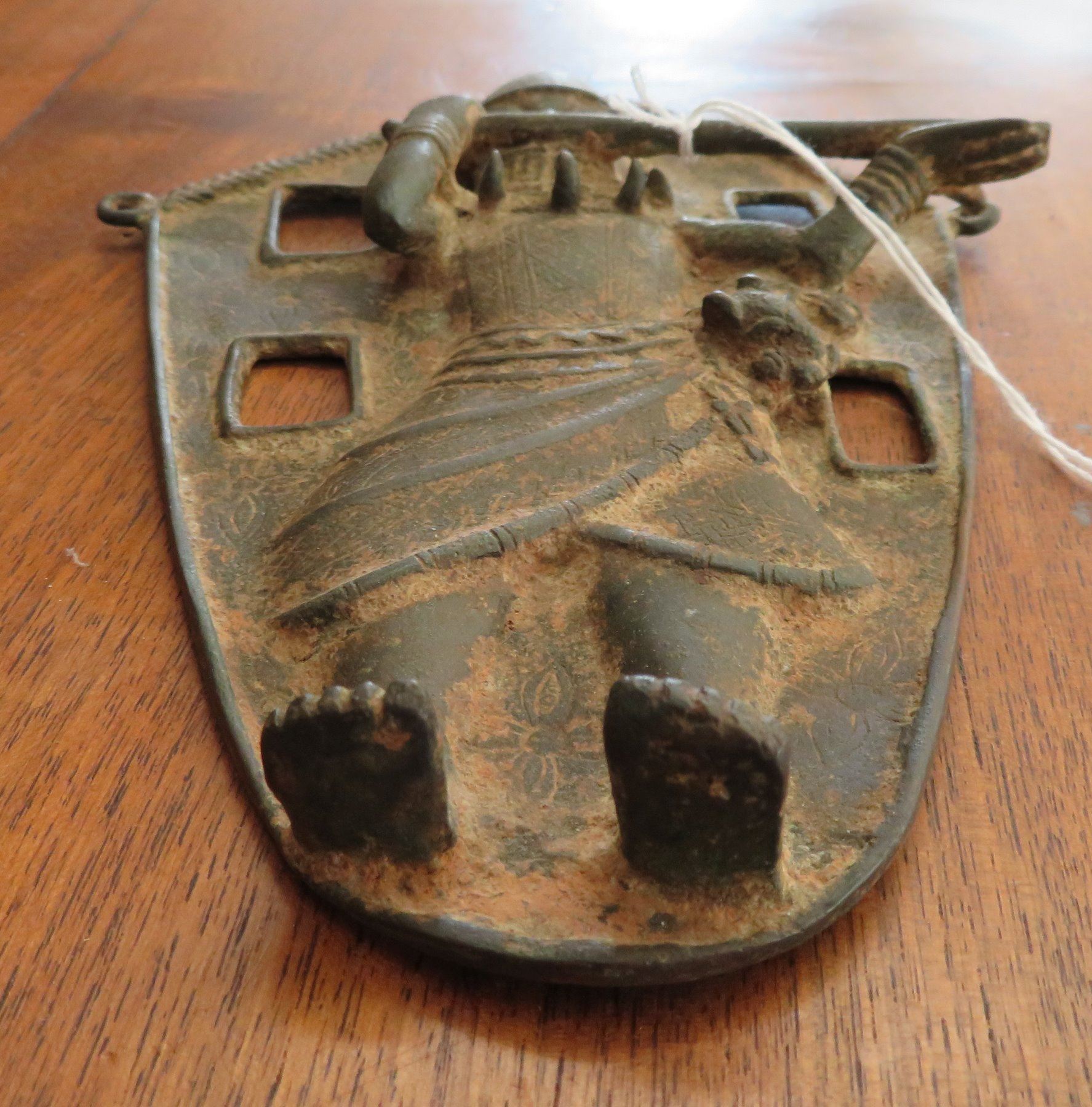 Benin Bronze Plaque, late 19th century. Made of bronze alloy, the item measures 8". Nigeria. Figure playing flute. Condition: Good, see images. Shipping: $24.50 w/insurance and signature.