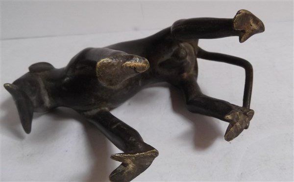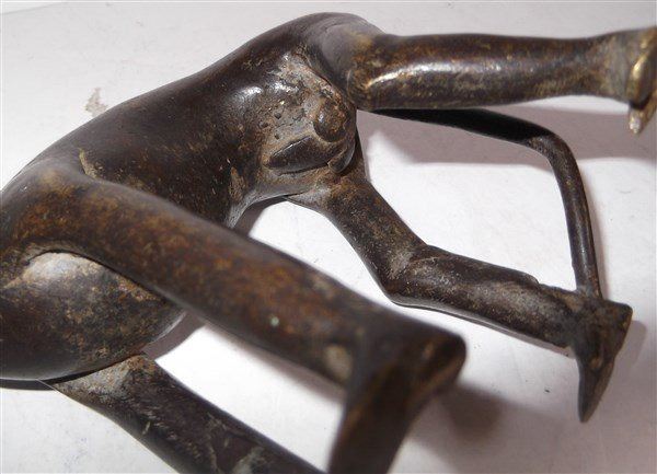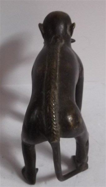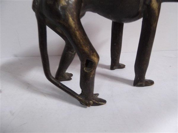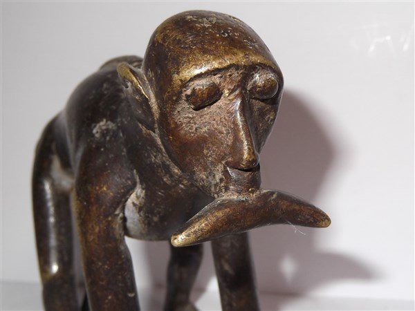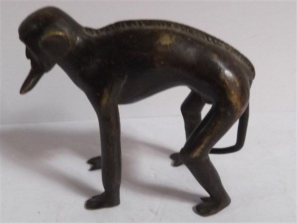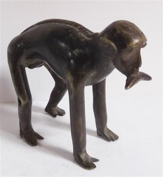 Benin bronze monkey. Hole in leg. 4 1/4 inches high x 5 inches wide.
