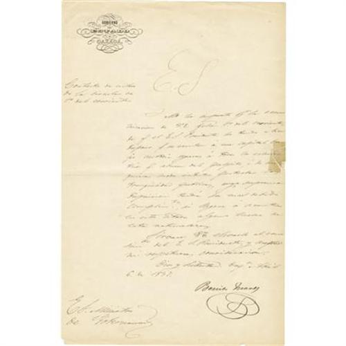 <B>Benito Juarez Manuscript Document Signed,</B></I> one page, 8.5” x 13.25”, Oaxaca, Mexico, April 6, 1847. Secretarially penned in Spanish on the Governor of Oaxaca's letterhead and signed by Juarez as chief executive of that important Mexican state. Old tape repair to right margin, else very fine condition. Benito Juarez (1806-1872) has long been symbolic of Mexico's 19th century struggle for democracy. Exiled by dictator Santa Anna and opposed by “Emperor” Maximilian I, Juarez persevered and triumphed. His lifelong dedication to republican ideals and liberal reform has ensured everlasting affection for his memory. <BR><BR><b>Shipping:</b> Flat Material, Small (<a target="_blank" href="http://www.heritageauctions.com/common/shipping.php">view shipping information</a>)