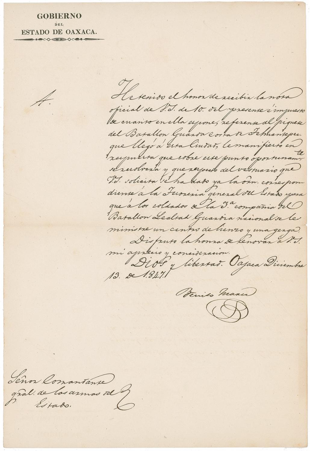 LS, in Spanish, signed as Governor of the State of Oaxaca, one-page, 8.5 x 12.5, Gobierno del Estado De Oaxaca letterhead, December 13, 1847. Letter to the Commander General of the Armaments of the State (Jose Maria Castellanos). In full (translated): “I have had the pleasure of receiving the official letter from Your Excellency, dated the 10th of this month, and am well versed about what is put forth therein, referring to the squad of the Coastguard Battalion of Tehuantepec which arrived to this city. In response, I declare to you that regarding this issue we propose that it will be resolved for you, and that regarding the wardrobe that Your Excellency requests, the corresponding order has already been given to the General Treasury of the State in order that a linen cloth and a hay mattress be ministered to the soldiers of the 3rd company of the Loyalty National Guard Battalion.” In fine condition, with intersecting folds, and a bit of scattered light toning.