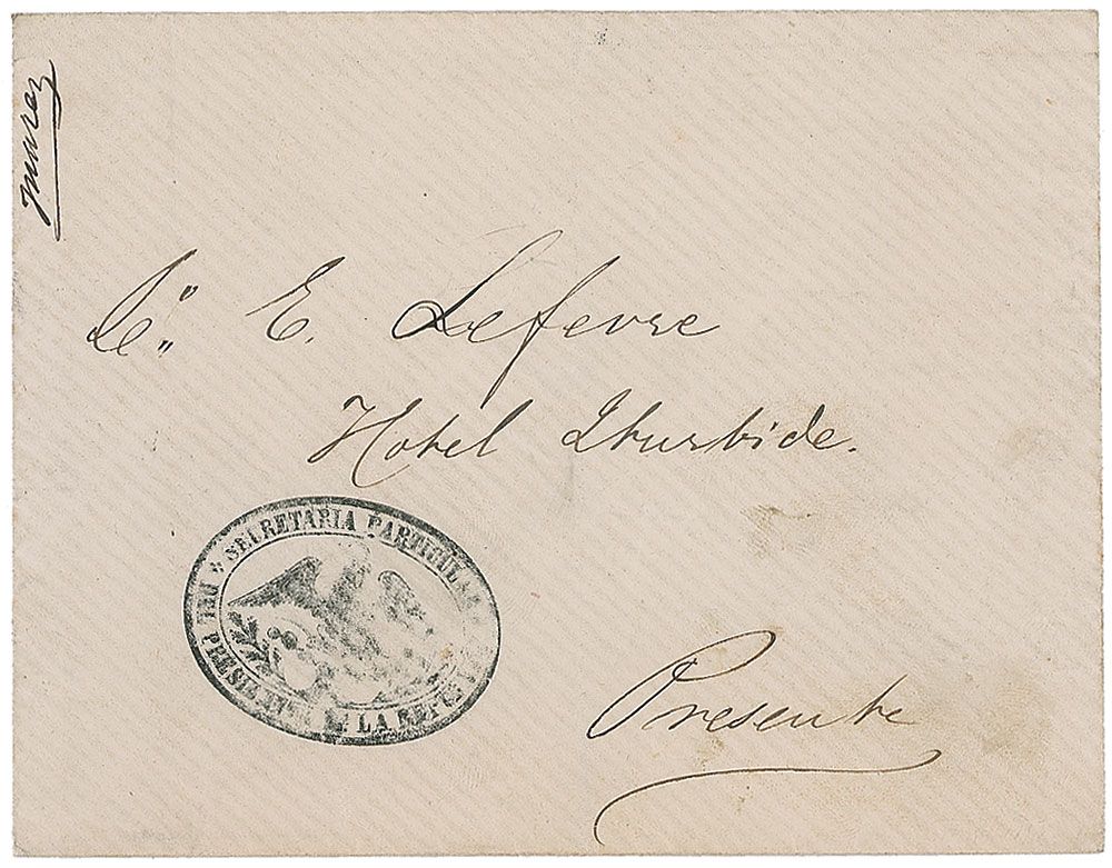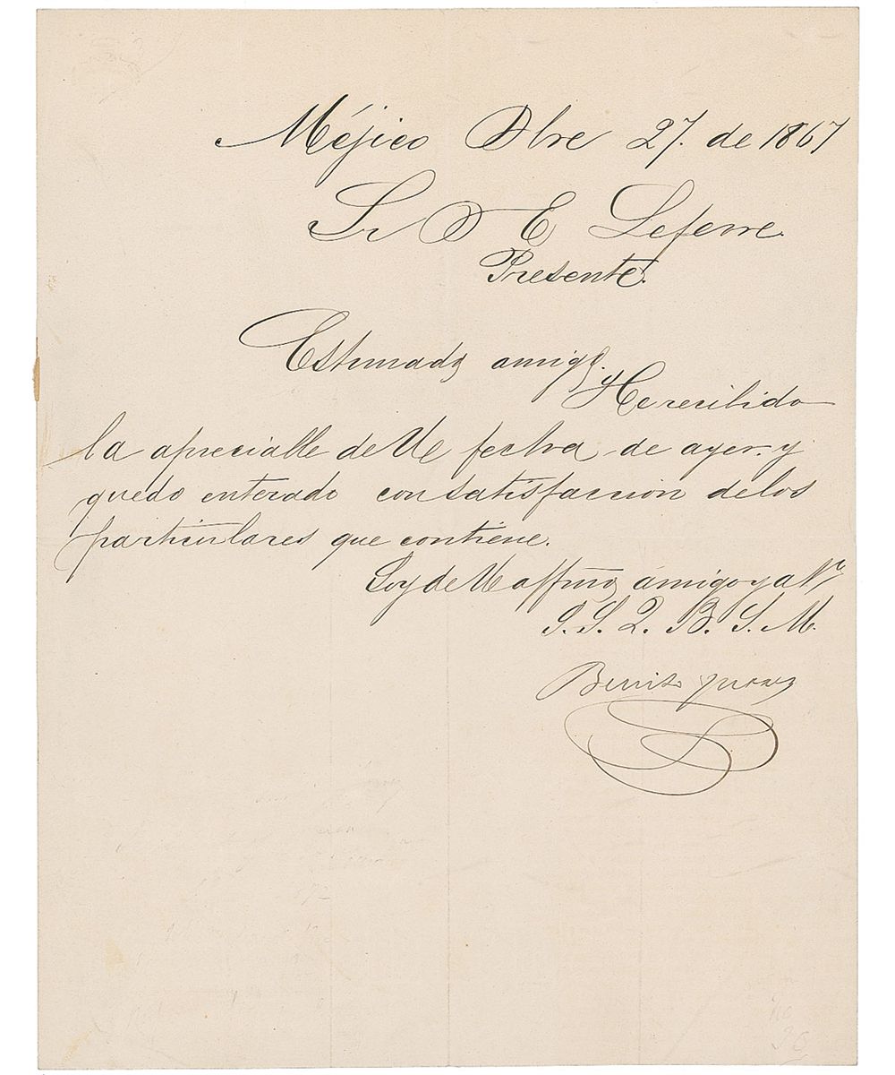 LS in Spanish signed as president of Mexico, one page, 8.25 x 10.75, December 27, 1867. Untranslated. In fine condition, with intersecting folds (one vertical fold passing through a single letter of the signature). Accompanied by the original mailing envelope, addressed in another hand.