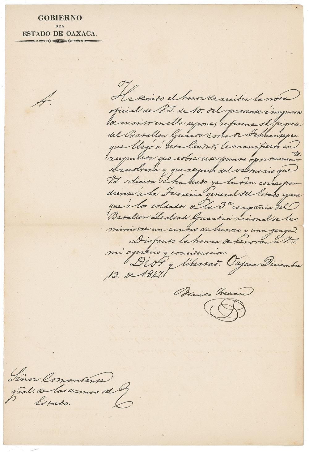 LS, in Spanish, signed as Governor of the State of Oaxaca, one-page, 8.5 x 12.5, Gobierno del Estado De Oaxac letterhead, December 13, 1847. Letter to the Commander General of the Armaments of the State (Jose Maria Castellanos). In full, “I have had the pleasure of receiving the official letter from Your Excellency, dated the 10th of this month, and am well versed about what is put forth therein, referring to the squad of the Coastguard Battalion of Tehuantepec which arrived to this city. In response, I declare to you that regarding this issue we propose that it will be resolved for you, and that regarding the wardrobe that Your Excellency requests, the corresponding order has already been given to the General Treasury of the State in order that a linen cloth and a hay mattress be ministered to the soldiers of the 3rd company of the Loyalty National Guard Battalion.” In fine, clean condition, with light intersecting folds.