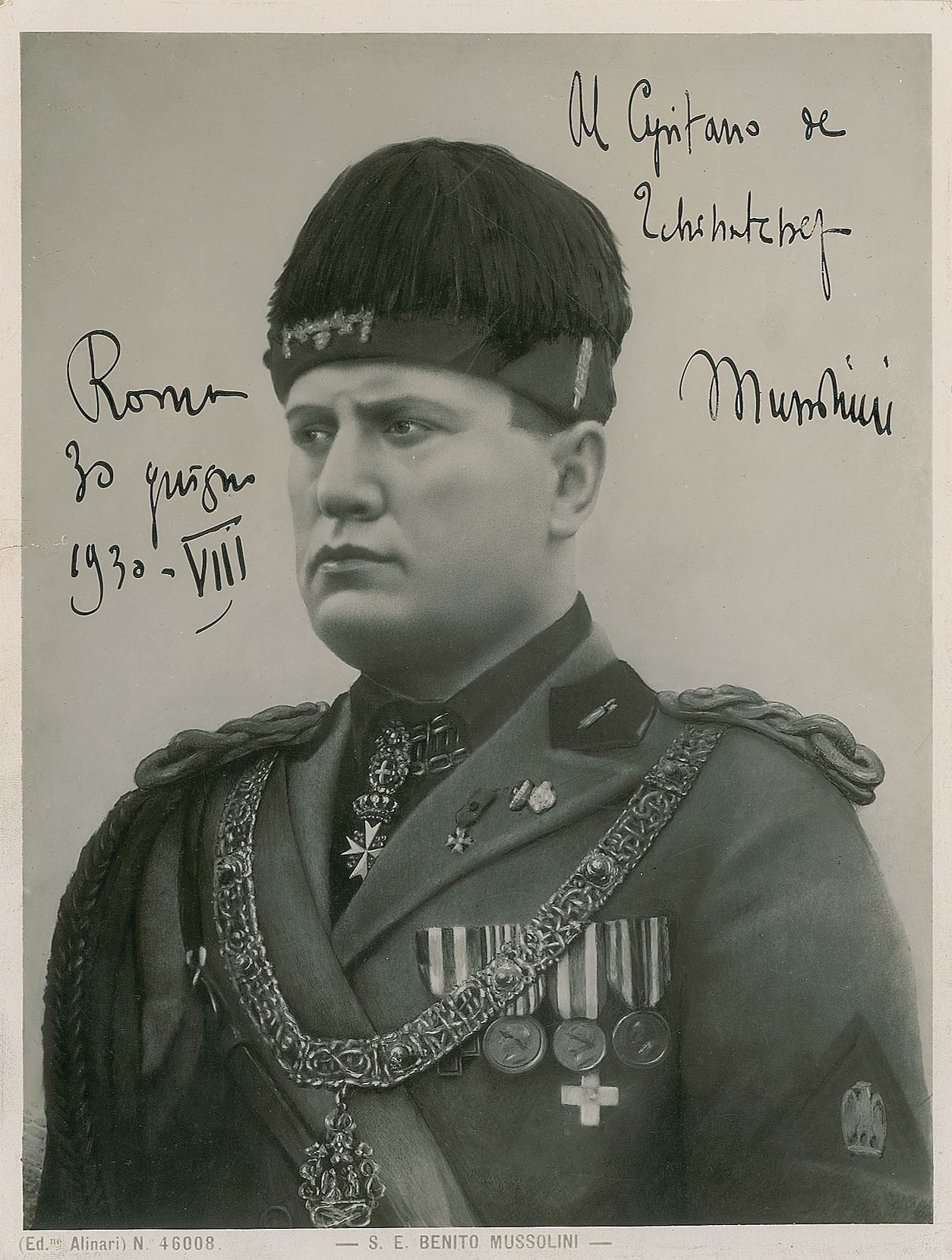 Imposing vintage matte-finish 7.75 x 10.25 photo of Mussolini in uniform, boldly signed and inscribed in fountain pen, "Al Capitano…Mussolini, Roma, 30 Giugno, 1930 - VIII.” In very good to fine condition, with trimmed edges, scattered creasing, a repaired tear to the left edge, and some scratching which touches Mussolini's face.
