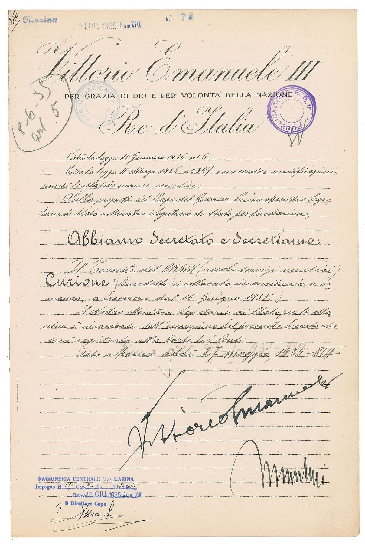 Partly-printed DS in Italian, one page, 9.5 x 14.5, May 27, 1935. Untranslated official document, boldly signed at the conclusion in ink, "Mussolini" and "Vittorio Emanuele." In fine condition, with tiny binding holes along the left edge.