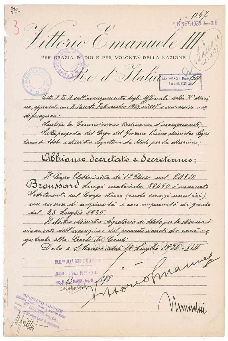 Partly-printed DS, in Italian, one page, 9.75 x 14.5, July 1935. An untranslated document signed at the bottom, “Vittorio Emanuele” and “Mussolini.” Light creasing, uneven left edge from removal from binding, paperclip impression at top edge, and official pencil notations and stampings, otherwise fine condition.