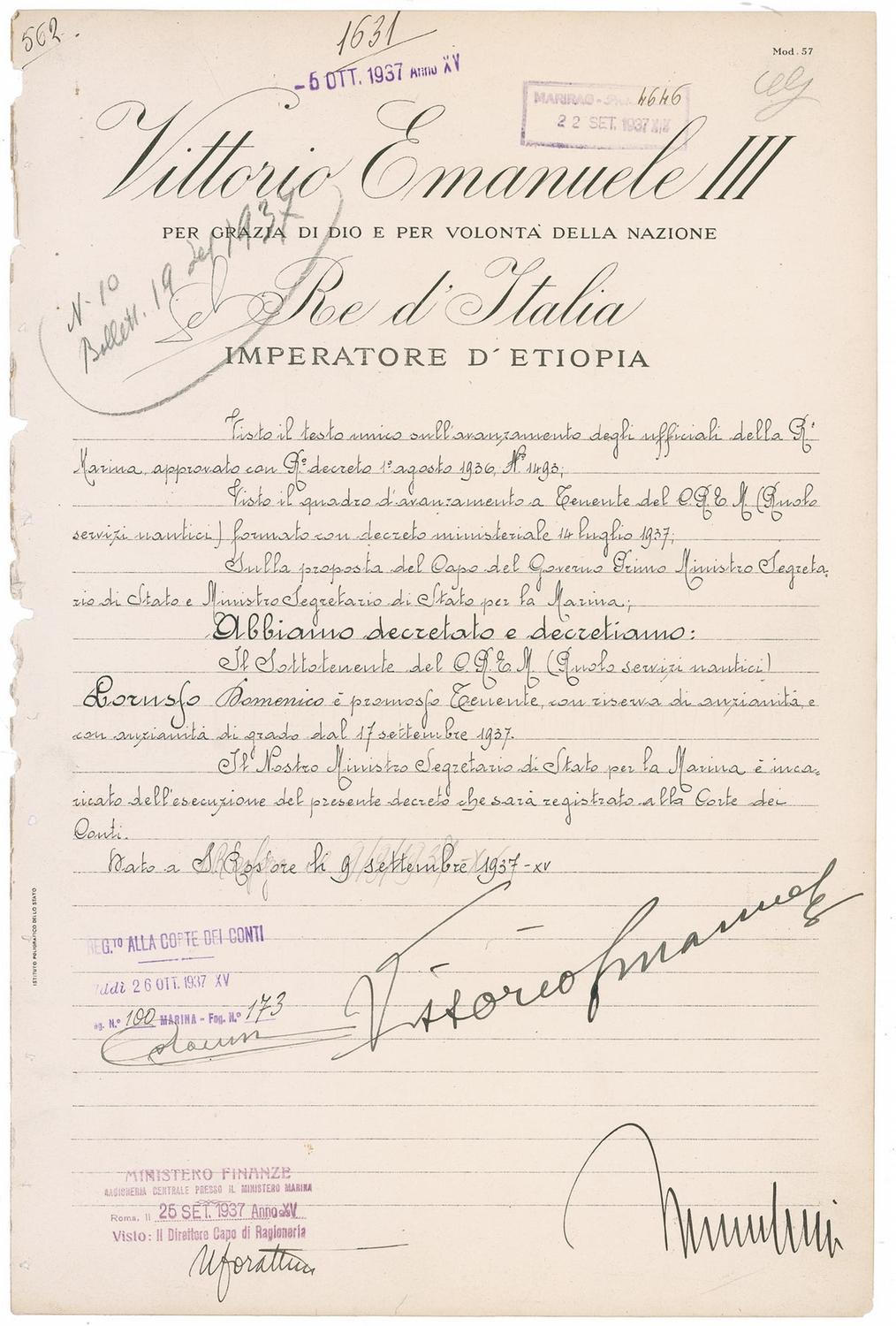 DS, in Italian, one page, 9 x 14, September 9, 1937. An untranslated military appointment, signed at the conclusion, “Vittorio Emanuele” and “Mussolini.” Expected stamps and official notations, some light wrinkling and toning, and marginal binding holes to left edge, otherwise fine condition.