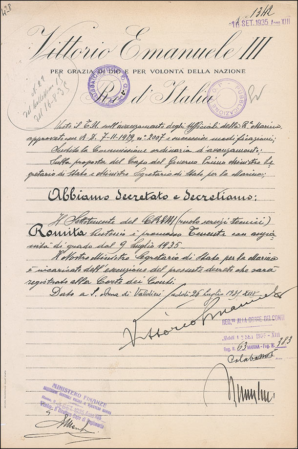 DS, in Italian, one page both sides, 9.5 x 14.5, September 12, 1935. An untranslated document, boldly signed at the conclusion, “Vittorio Emanuele” and “Mussolini.” Some scattered creasing, edge toning, expected stamps and notations, and marginal binding holes and dings, otherwise fine condition.