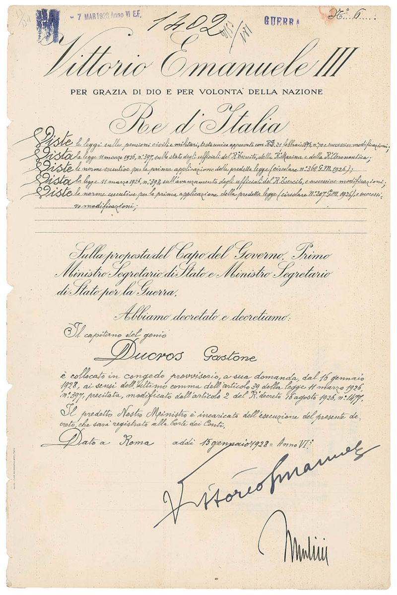 Partly-printed DS, in Italian, one page, 9.5 x 14.5, January 15, 1928. Untranslated document, signed at the conclusion “Mussolini” and “Vittorio Emanuele.” A diagonal crease, multiple dings and tears to the left edge, scattered tack holes, and various stamps and notations, otherwise very good condition.