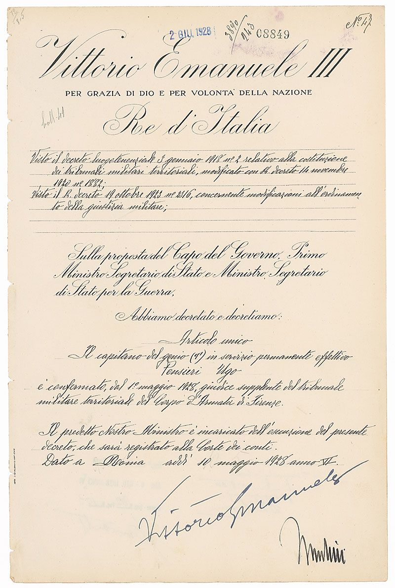 Partly-printed DS in Italian, one page, 9.5 x 14.5, May 10, 1928. A single article decree boldly signed at the conclusion, “Mussolini” and “Vittorio Emanuele.” In fine condition, with expected stamps and document wear and marginal binding holes to left edge.