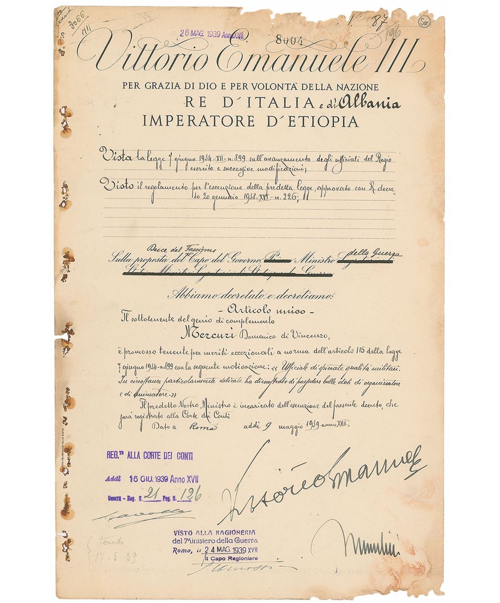 Partly-printed DS in Italian, one page, 9.75 x 14.5, May 9, 1939. An untranslated official document signed at the conclusion in bold ink, “Mussolini” and “Vittorio Emanuele.” In very good condition, with significant staining to edges (approaching but not affecting Mussolini’s signature), and noticeable paper loss to top and bottom edges.