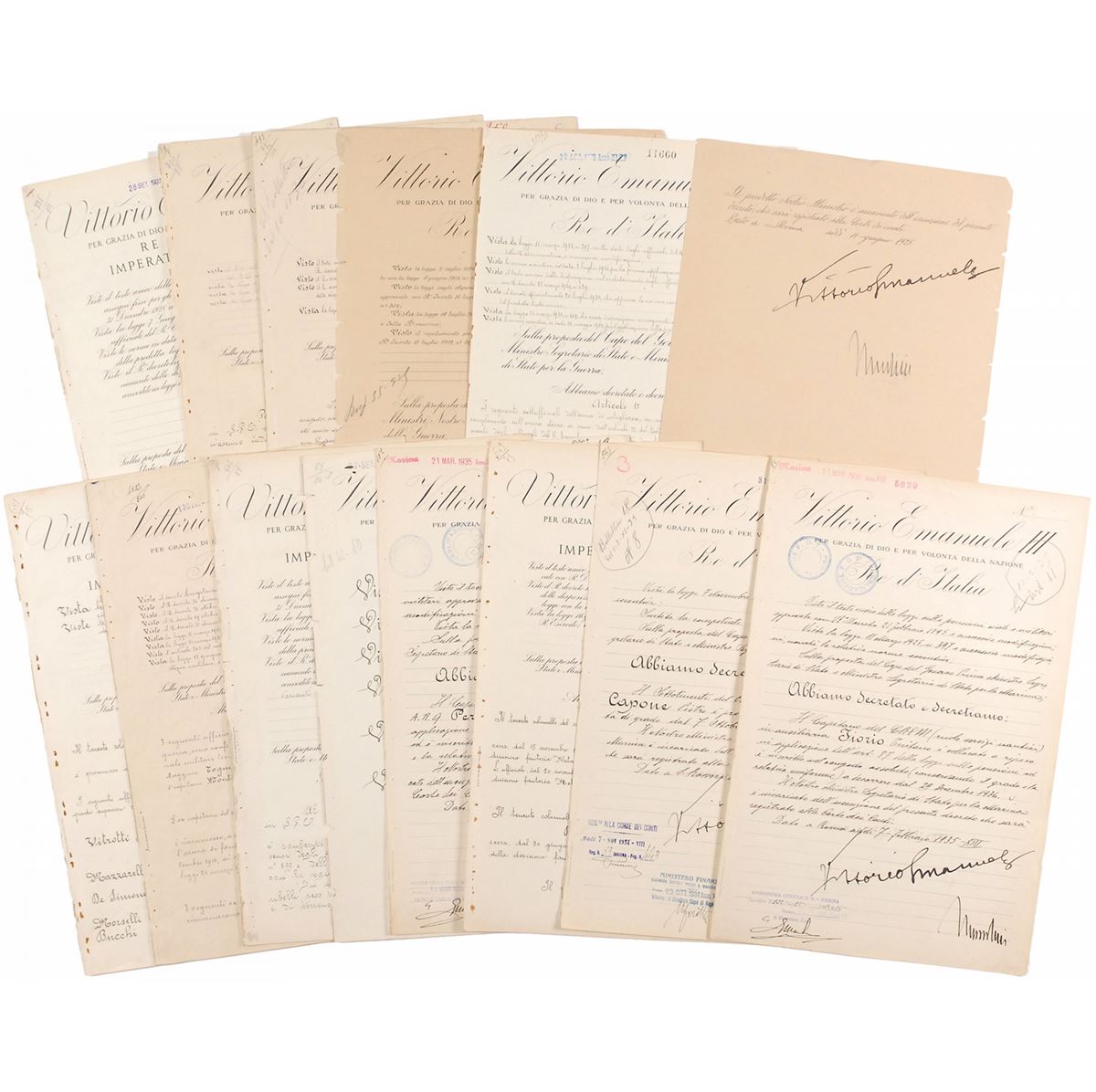 Collection of 14 untranslated DSs in Italian, totaling 32 pages, each approximately 9.5 x 14.5, dated between 1925 and 1937. All are signed at the conclusion by both leaders, “Mussolini” and “Vittorio Emanuele.” In overall very good to fine condition, with expected document wear.