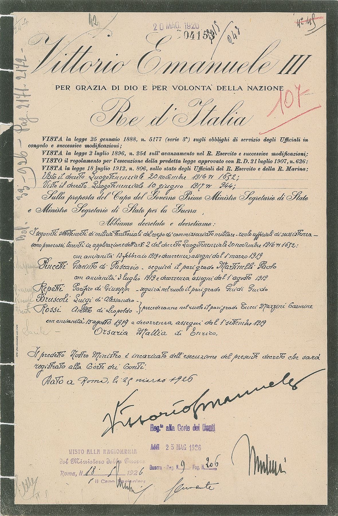 Partly-printed DS in Italian, one page, 9.25 x 14, March 25, 1926. Untranslated official document signed at the conclusion in bold ink, "Mussolini" and "Vittorio Emanuele." In fine condition, with old binding slits along the left edge.