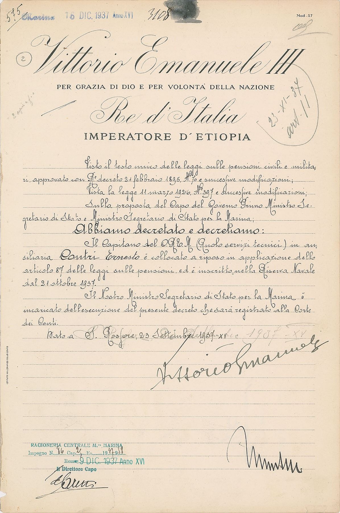 Manuscript DS in Italian, one page, 9.75 x 14.5, September 23, 1937. Untranslated official document signed at the conclusion in bold ink, "Mussolini" and "Vittorio Emanuele." In fine condition.