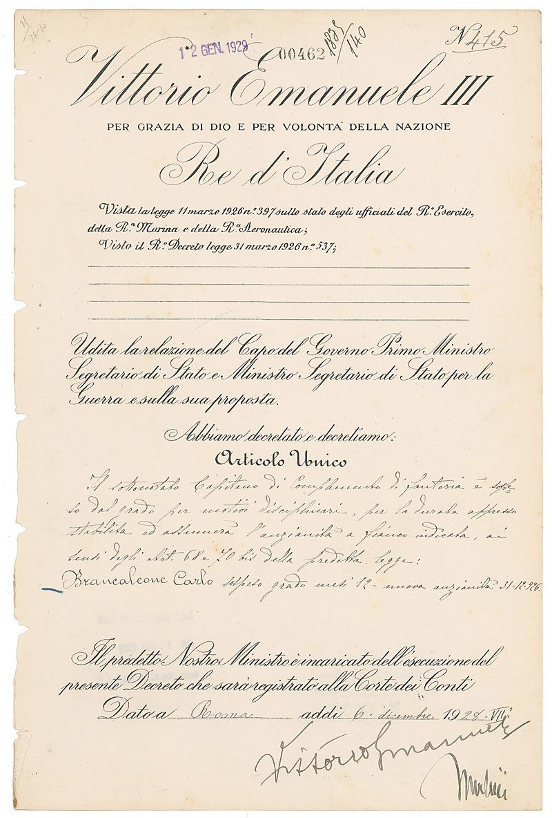 Partly-printed DS in Italian, one page, 9.5 x 14.5, December 6, 1928. Untranslated official document, signed at the conclusion by Mussolini and Vittorio Emmanuele III. In fine condition, with expected document wear and binding holes along the left edge.