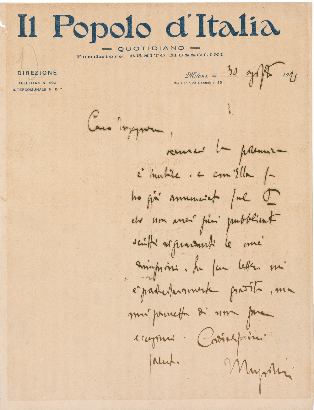 Early and boldly-penned ALS in Italian, signed “Mussolini,” one page, 8.5 x 11, Il Popolo d’Italia letterhead, August 30, 1921. Letter to an engineer stating that discussing the matter of his resignation from the newspaper is useless as he has already made the announcement he is leaving, and he cannot make an exception and discuss the matter further. In part (translated): “By now all controversy has become pointless…I already announced in the P. that I shall not publish any further articles concerning my resignation.” In very good condition, with a central horizontal and vertical fold, uniform mild toning from previous display, light creasing along the right edge, and small chip to top left corner. This historically significant correspondence is one of the stepping stones that took Mussolini, and Italy, on a course that led them toward World War II. By 1922, crowds of peasants were spellbound by Mussolini’s magnetism and oratory, and King Victor Emmanuel III was forced to bow before a Fascist march on Rome to seize the government. A pivotal part of world history. Accompanied by its original Walter Benjamin Autographs Inc. wrapping and description.