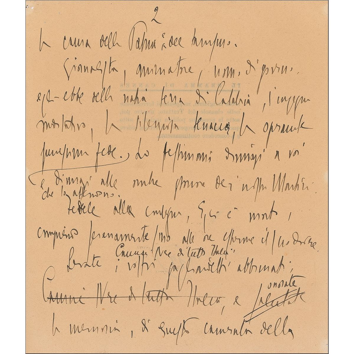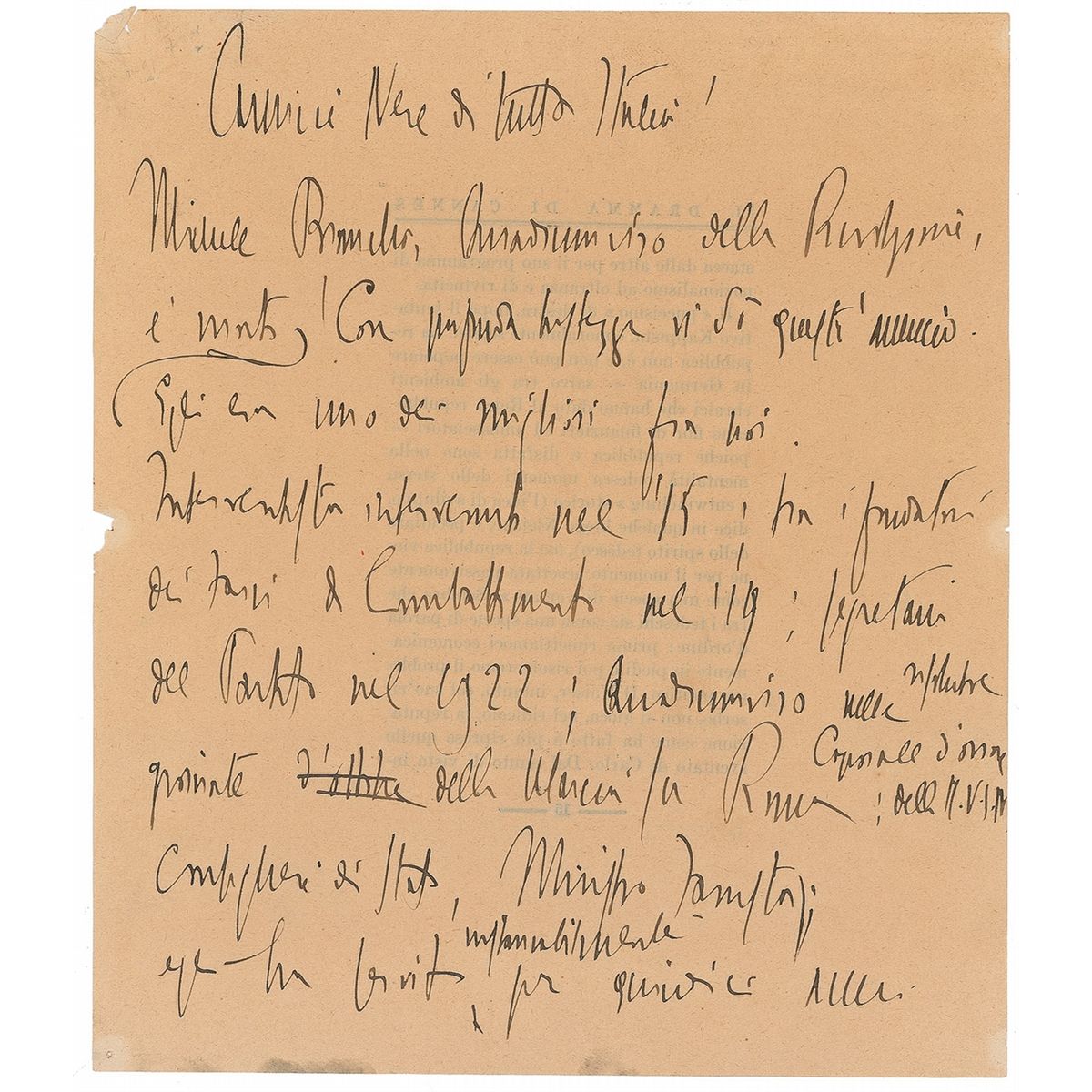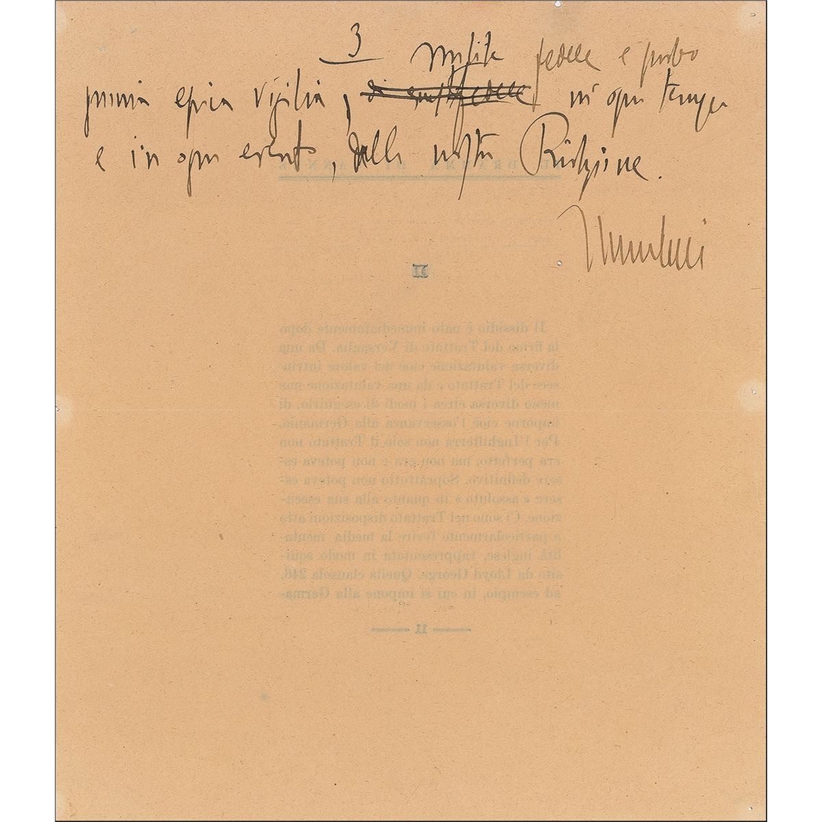 Bombastic Italian dictator and leader of the National Fascist Party (1883–1945). Known as ‘Il Duce,’ he brought Italy into the Axis powers. Handwritten speech, in Italian, signed “Mussolini,” three pages on the reverse of book proof pages, 8 x 9.5, no date, but circa Feberuary 1930, being Mussolini's eulogy for the Italian Fascist Party's General Secretary, Michele Bianchi. In full (translated): “Black Shirts of Italy! Michele Bianchi, Quadrumvir of the Republic, has died. With profound sadness I announce this to you. He was one of the best among us. Interventionist, he intervened in 1915; was among the founders of the Fasci di Combattimento (Fascist Party) in 1919; secretary of the party in 1922; quadrumvir during the decisive days of the march on Rome; honoured corporal of the Voluntary Militia for National Security; State Councillor; Fascist Minister; he tirelessly served the cause of the Fatherland and of Fascism for fifteen years. Journalist; statesman, he took from his native land of Calabria his intelligence, his silent perseverance, his active faith. I am witness to this before you and before the glorious shadows of our martyrs that are waiting for him. Faithful to his orders, he died, fulfilling his duty until his last moments. Black Shirts of Italy, raise your flag to half-mast, and honour the memory of this comrade of our first epic vigil, faithful warrior - ready at any time and in any event - of our Revolution.” In very good to fine condition, with tack holes to edges, small tears to top left corners, and uniform toning.