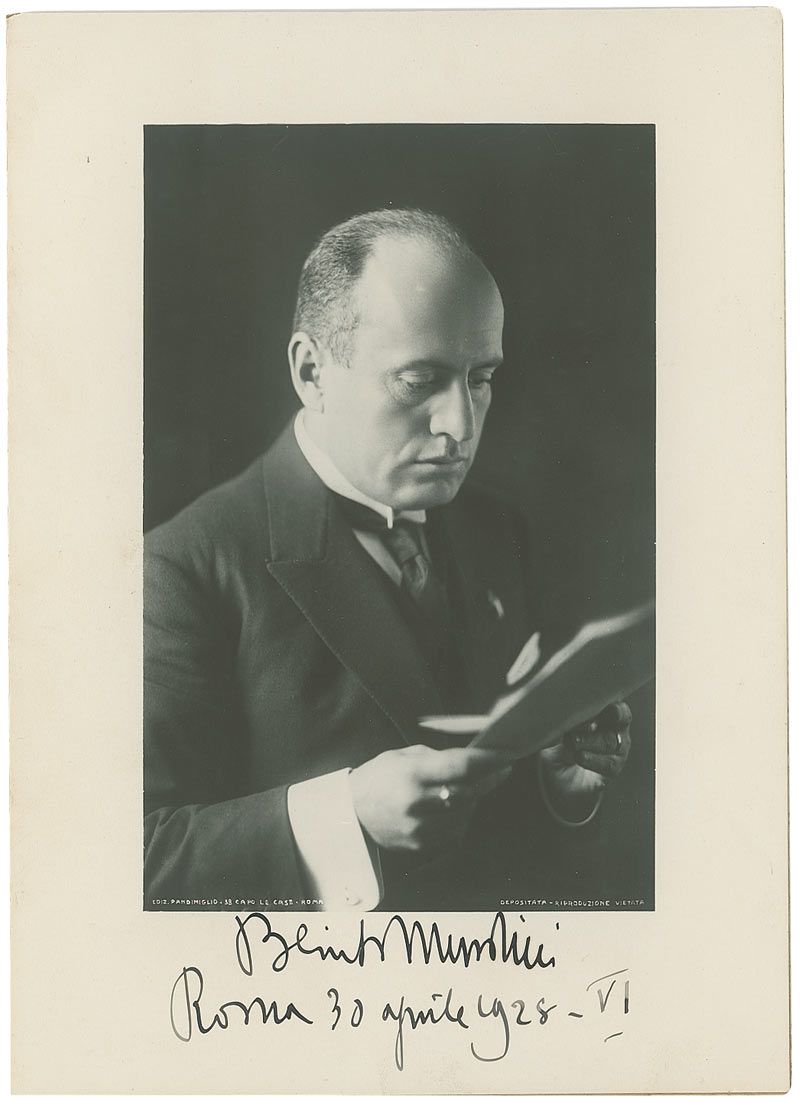 Vintage matte-finish 8 x 11.25 photo of Mussolini reading from a page, neatly signed in the lower border in fountain pen “Benito Mussolini, Roma 30 aprile 1928–VI.” Photo is afixed to an identical size board. In fine condition. Accompanied by a full letter of authenticity from James Spence Authentication. A terrific pose, made all the better by Mussolini signing with his far less common full name.