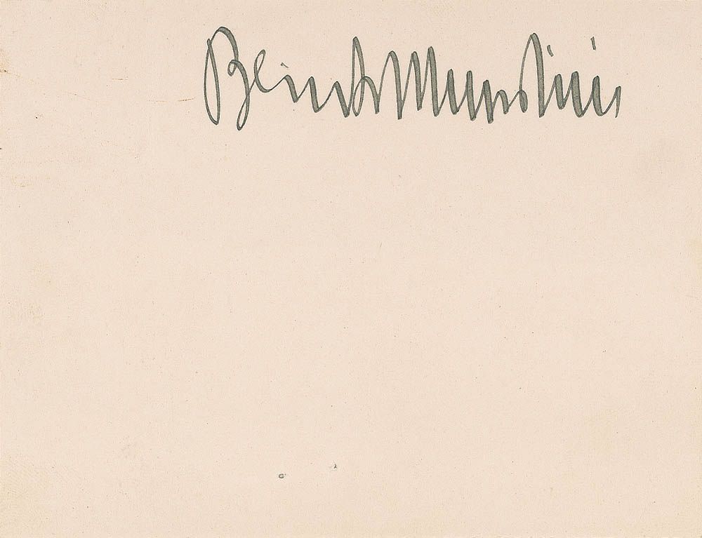 Vintage ink signature, “Benito Mussolini,” on an off-white 5 x 4 card. In fine condition, with a paperclip impression to the left of the signature and staple holes to the lower border. Accompanied by two letters of transmittal dated 1928, signed by Italian Consul Generals Zunini and Ferme.